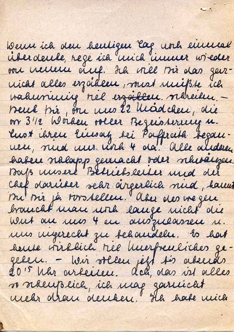 Wenn ich den heutigen Tag noch einmal überdenke, rege ich mich immer wieder von neuem auf. Ich will Dir das garnicht alles erzählen, sonst müßte ich wahnsinnig viel schreiben. – Denk Dir, von uns 22 Mädchen, die vor 3 ½ Wochen voller Begeisterung u. Lust ihren Einsatz bei Paffrath begannen, sind nur noch 4 da. Alle anderen haben schlapp gemacht oder schwänzen. Daß unsere Betriebsleiter und der Chef darüber sehr ärgerlich sind, kannst Du Dir ja vorstellen. Aber deswegen braucht man noch lange nicht die Wut an uns 4en auszulassen u. uns ungerecht zu behandeln. Es hat heute wirklich viel Unerfreuliches gegeben. – Wir sollen jetzt bis abends 20.15 Uhr arbeiten. Ach, das ist alles so scheußlich, ich mag garnicht mehr dran denken. Ich habe mich