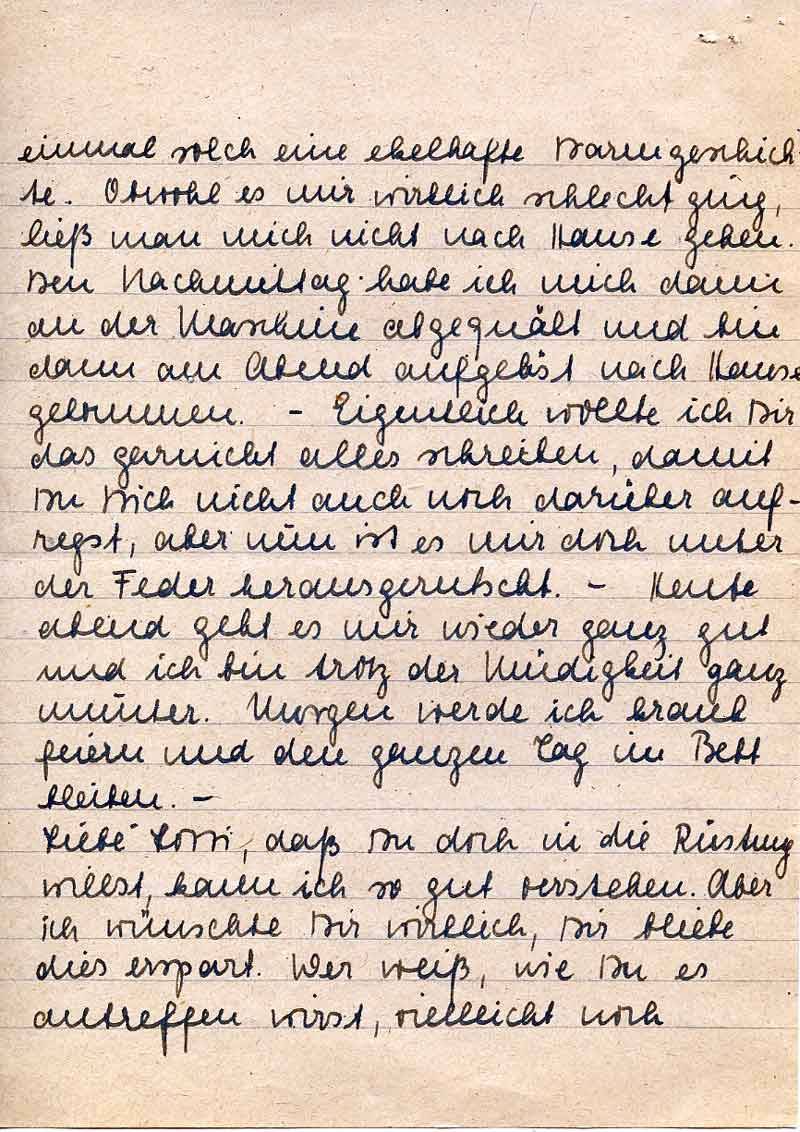 einmal solch eine ekelhafte Darmgeschichte. Obwohl es mir wirklich schlecht ging, ließ man mich nicht nach Hause gehen. Den Nachmittag habe ich mich dann an der Maschine abgequält und bin dann am Abend aufgelöst nach Hause gekommen. – Eigentlich wollte ich Dir das garnicht alles schreiben, damit Du Dich nicht auch noch darüber aufregst, aber nun ist es mir doch unter der Feder herausgerutscht. – Heute abend geht es mir wieder ganz gut und ich bin trotz der Müdigkeit ganz munter. Morgen werde ich krank feiern und den ganzen Tag im Bett bleiben. -