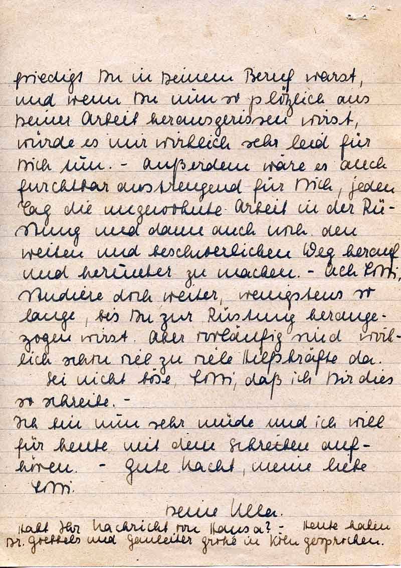 tausendmal schlimmer als ich, da doch die meisten Arbeitsstellen u. Rüstungsbetriebe schon von neuen Hilfskräften überfüllt sind. Ich sehe es doch in unserem Betrieb. Täglich kommen neue Frauen hin, so daß garnicht mehr genug Arbeit für sie da ist. Und das hört man von allen anderen Stellen auch. Und daß Du, wo jetzt doch so viele Kräfte herangezogen sind, dann in einen Betrieb kommst, wo Du wahrscheinlich nachher garnicht gebrauchst wirst, sehe ich einfach nicht ein. – Studiere doch weiter. Sieh‘ mal, es wäre doch schrecklich, wenn Du nachher wieder neu anfangen mußt.
