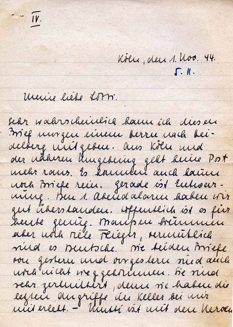 Sehr wahrscheinlich kann ich diesen Brief morgen einem Herrn nach Heidelberg mitgeben. Aus Köln und der näheren Umgebung geht keine Post mehr raus. Es kommen auch kaum noch Briefe rein. Gerade ist Entwarnung. Den 1. Abendalarm haben wir gut überstanden. Hoffentlich ist es für heute genug. Draußen brummen aber noch viele Flieger, vermutlich sind es Deutsche. Die beiden Briefe von gestern und vorgestern sind auch noch nicht weggekommen. Sie sind sehr zerknittert, denn sie haben die letzten Angriffe im Keller bei mir miterlebt. – Mutti ist mit den Nerven