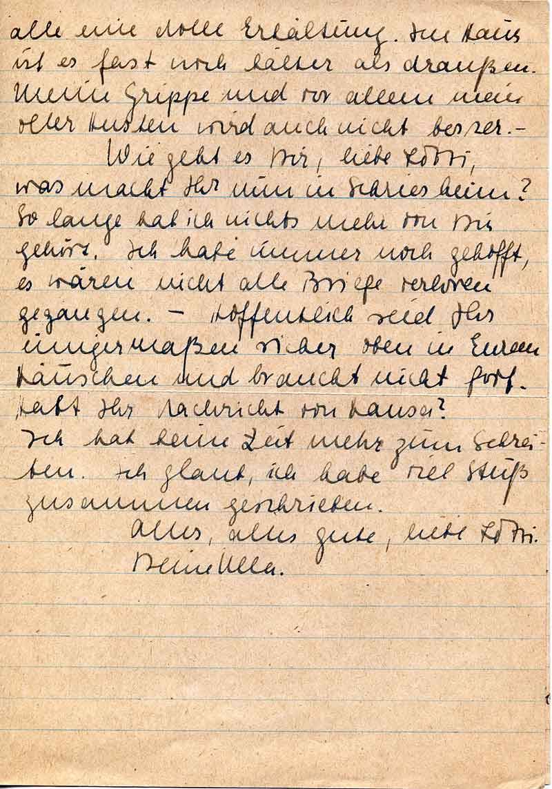 Wie geht es Dir, liebe Lotti, was macht Ihr nun in Schriesheim? So lange hab ich nichts mehr von Dir gehört. Ich habe immer noch gehofft, es wären nicht alle Briefe verloren gegangen. – Hoffentlich seid Ihr einigermaßen sicher oben in Eurem Häuschen und braucht nicht fort. Habt Ihr Nachricht von Hansa?