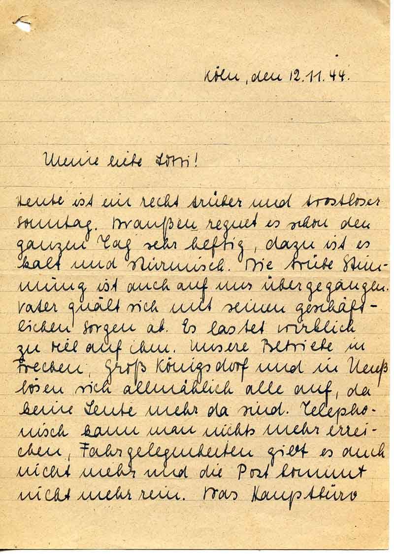 Heute ist ein recht trüber und trostloser Sonntag. Draußen regnet es schon den ganzen Tag sehr heftig, dazu ist es kalt und stürmisch. Die trübe Stimmung ist auch auf uns übergegangen. Vater quält sich mit seinen geschäftlichen Sorgen ab. Es lastet wirklich zu viel auf ihm. Unsere Betriebe in Frechen, Groß Königsdorf und in Neuß lösen sich allmählich alle auf, da keine Leute mehr da sind. Telephonisch kann man nichts mehr erreichen, Fahrgelegenheiten gibt es auch nicht mehr und die Post kommt nicht mehr rein. Das Hauptbüro