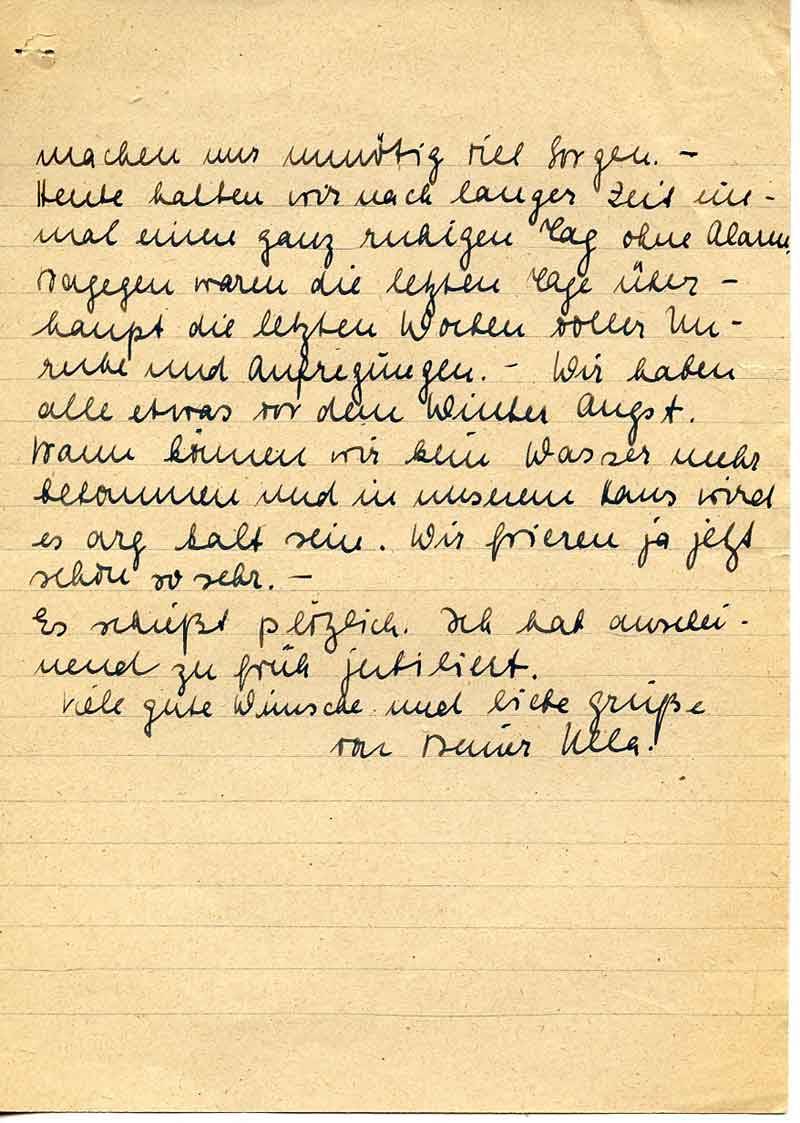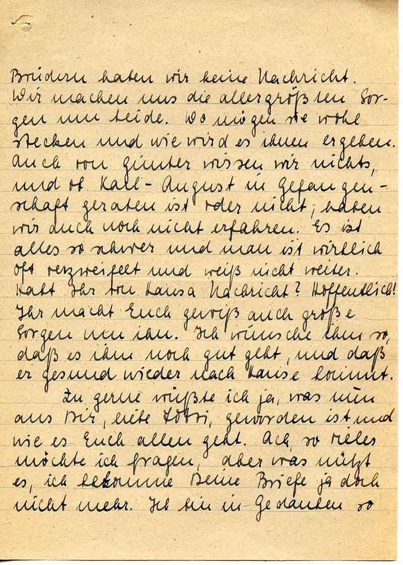 Brüdern haben wir keine Nachricht. Wir machen uns die allergrößten Sorgen um beide. Wo mögen sie wohl stecken und wie wird es ihnen ergehen. Auch von Günter wissen wir nichts, und ob Karl-August in Gefangenschaft geraten ist oder nicht, haben wir auch noch nicht erfahren. Es ist alles so schwer und man ist wirklich oft verzweifelt und weiß nicht weiter. Habt Ihr von Hansa Nachricht? Hoffentlich! Ihr macht Euch gewiß auch große Sorgen um ihn. Ich wünsche ihm so, daß es ihm noch gut geht, und daß er gesund wieder nach Hause kommt.