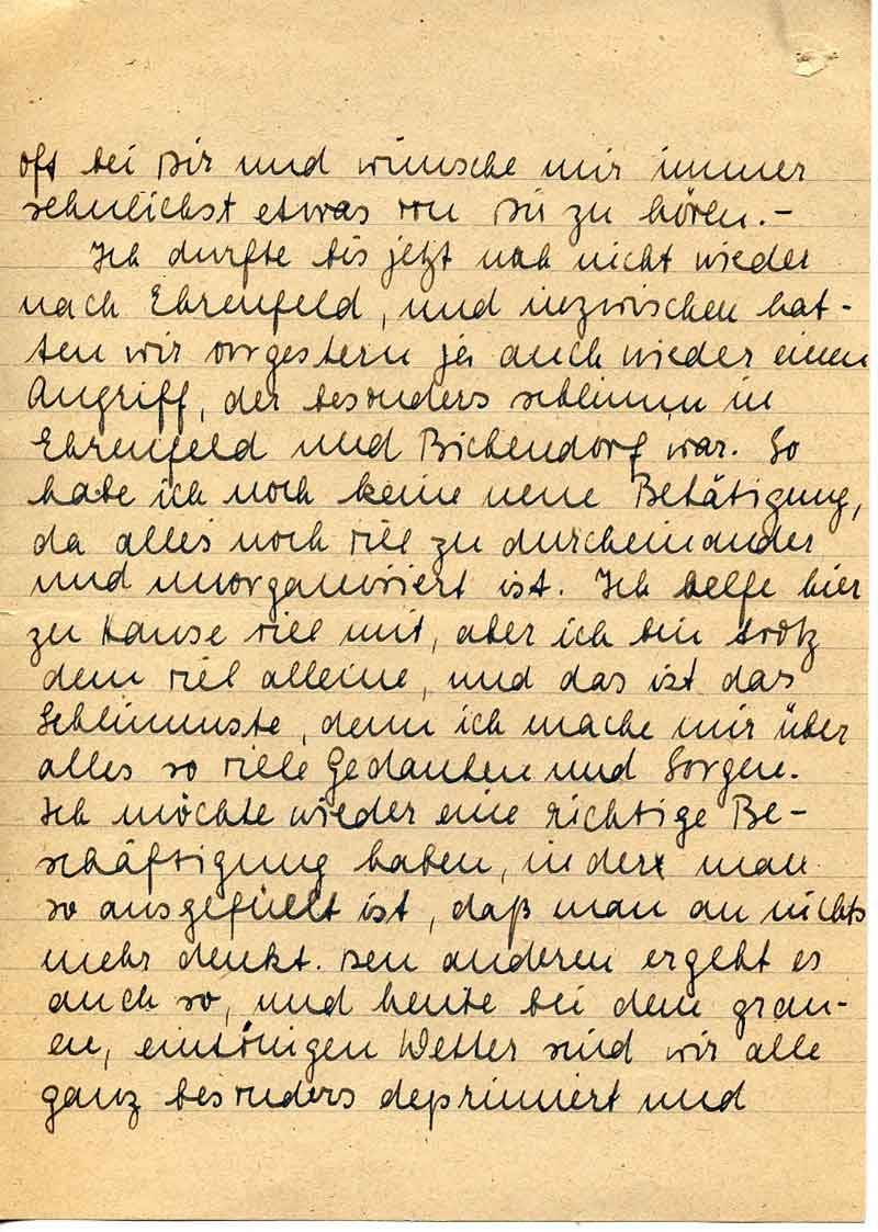 Ich durfte bis jetzt noch nicht wieder nach Ehrenfeld, und inzwischen hatten wir vorgestern ja auch wieder einen Angriff, der besonders schlimm in Ehrenfeld und Bickendorf war. So habe ich noch keine neue Betätigung, da alles noch viel zu durcheinander und unorganisiert ist. Ich helfe hier zu Hause viel mit, aber ich bin trotz dem viel alleine, und das ist das Schlimmste, denn ich mache mir über alles so viele Gedanken und Sorgen. Ich möchte wieder eine richtige Beschäftigung haben, in der man so ausgefüllt ist, daß man an nichts mehr denkt. Den anderen ergeht es auch so, und heute bei dem grauen, eintönigen Wetter sind wir alle ganz besonders deprimiert und