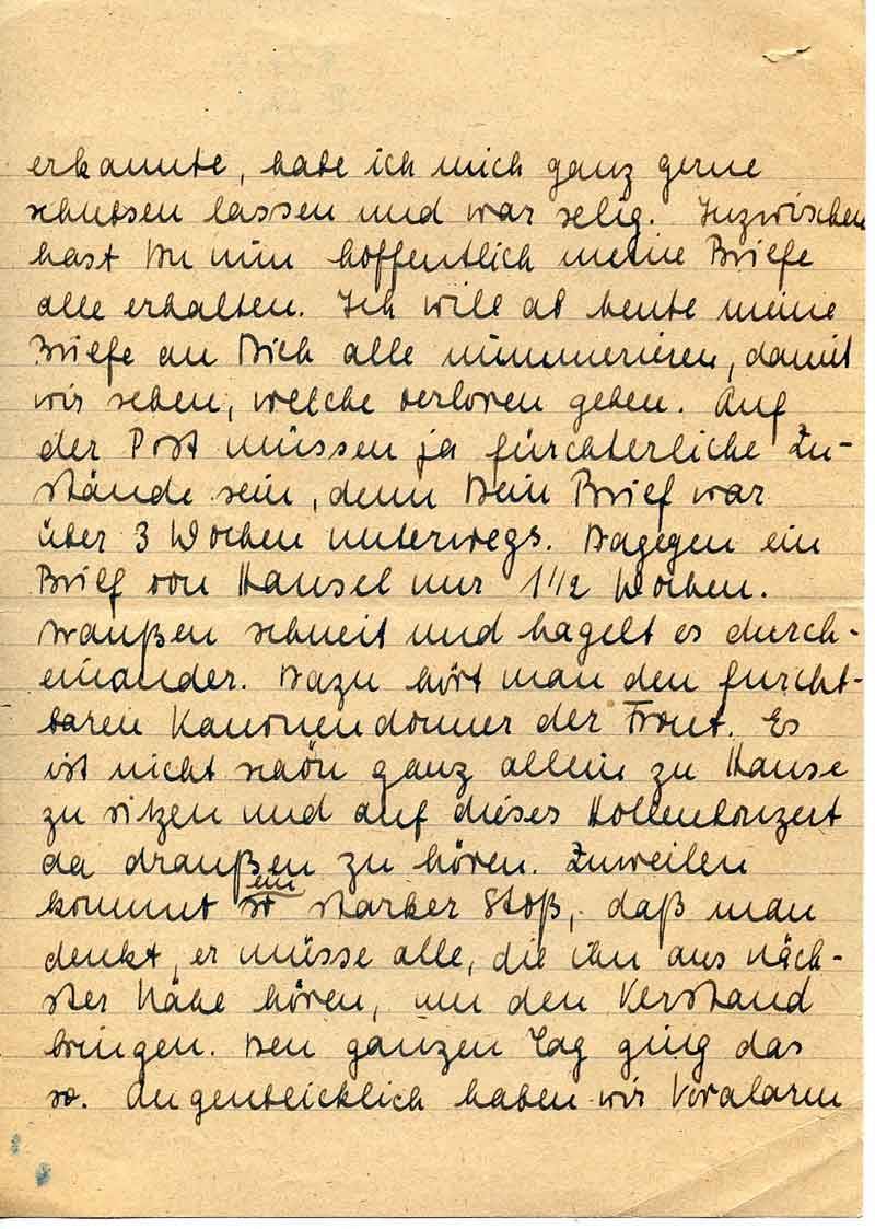 erkannte, habe ich mich ganz gerne schubsen lassen und war selig. Inzwischen hast Du nun hoffentlich meine Briefe alle erhalten. Ich will ab heute meine Briefe an Dich alle nummerieren, damit wir sehen, welche verloren gehen. Auf der Post müssen ja fürchterliche Zustände sein, denn Dein Brief war über 3 Wochen unterwegs. Dagegen ein Brief von Hansel nur 1 ½ Wochen.
