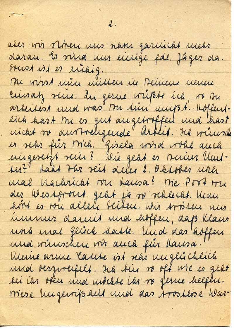 Du wirst nun mitten in Deinem neuen Einsatz sein. Zu gerne wüßte ich, wo Du arbeitest und was Du tun mußt. Hoffentlich hast Du es gut angetroffen und hast nicht so anstrengende Arbeit. Ich wünsche es sehr für Dich. Gisela wird wohl auch eingesetzt sein? Wie geht es Deiner Mutter? Habt Ihr seit dem 2. Oktober noch mal Nachricht von Hansa? Die Post von der Westfront geht ja so schlecht. Man hört es von allen Seiten. Wir trösten uns immer damit und hoffen, daß Klaus noch mal Glück hatte. Und das hoffen und wünschen wir auch für Hansa.
