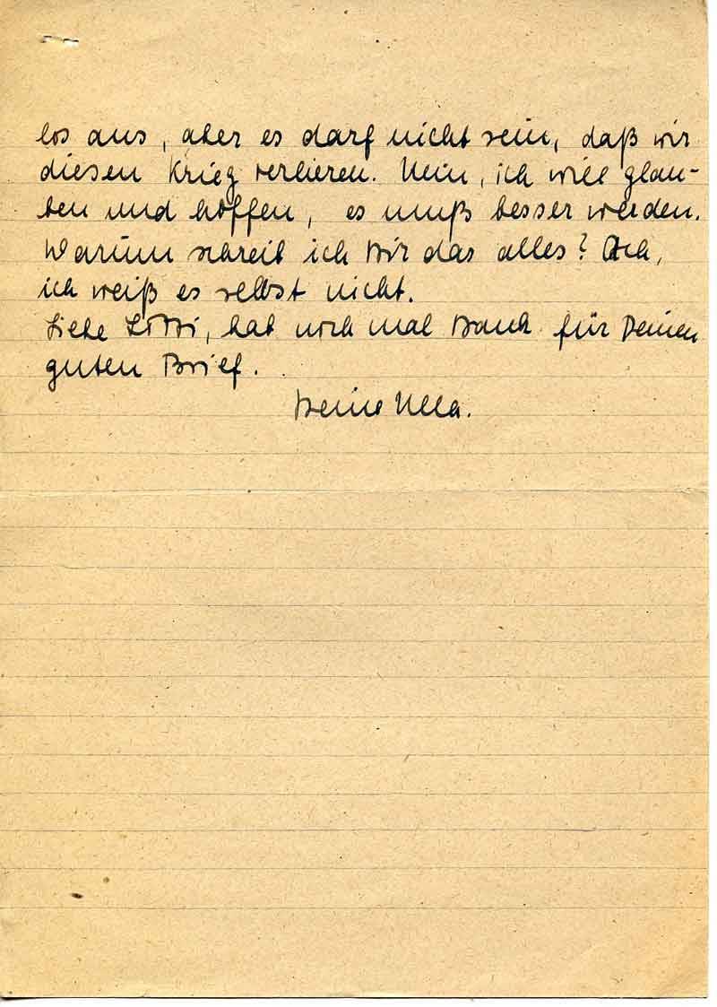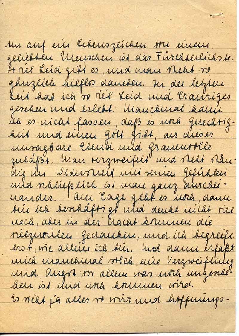 ten auf ein Lebenszeichen von einem geliebten Menschen ist das Fürchterlichste. So viel Leid gibt es, und man steht so gänzlich hilflos daneben. In der letzten Zeit hab ich so viel Leid und Trauriges gesehen und erlebt. Manchmal kann ich es nicht fassen, daß es noch Gerechtigkeit und einen Gott gibt, der dieses unsagbare Elend und Grauenvolle zuläßt. Man verzweifelt und steht ständig im Widerstreit mit seinen Gefühlen und schließlich ist man ganz durcheinander. Am Tage geht es noch, dann bin ich beschäftigt und denke nicht viel nach, aber in der Nacht kommen die vielzuvielen Gedanken, und ich begreife erst, wie allein ich bin. Und dann erfaßt mich manchmal solch eine Verzweiflung und Angst vor allem was noch ungeschehen ist und noch kommen wird.