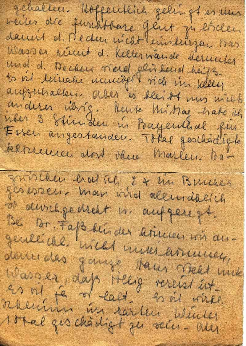 gehalten. Hoffentlich gelingt es mir weiter, die furchtbare Glut zu löschen, damit d. Decken nicht einstürzen. Das Wasser rinnt d. Kellerwände herunter und d. Decken sind glühend heiß. Es ist beinahe unmöglich sich im Keller aufzuhalten. Aber es bleibt uns nichts anderes übrig. Heute Mittag habe ich über 3 Stunden in Bayenthal für Essen angestanden. Total geschädigte bekommen dort ohne Marken. Dazwischen hab ich 2 x im Bunker gesessen. Man wird allmählich so durchgedreht u. aufgeregt. Bei Dr. Faßbinder können wir augenblickl. nicht unterkommen, denn das ganze Haus steht unter Wasser, daß völlig vereist ist. Es ist ja so kalt. Es ist wirkl. schlimm im harten Winter total geschädigt zu sein. Aber