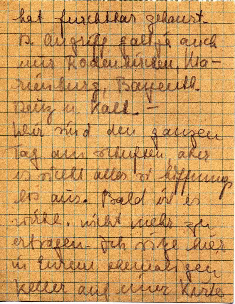 Heute war wieder ein Angriff. Zum Glück war es weiter weg, aber Angst hatten wir doch wieder. Heute ist es draußen plötzlich ganz warm. Es taut furchtbar und regnet ununterbrochen. Unsere geretteten Möbel werden alle naß. Es ist zum verzweifeln. – Ich war vorhin in d. Ortsgruppe am Schillingsrotterplatz. Auf diesem Weg hab ich erst gesehen, was alles in Marienburg passiert ist. Es