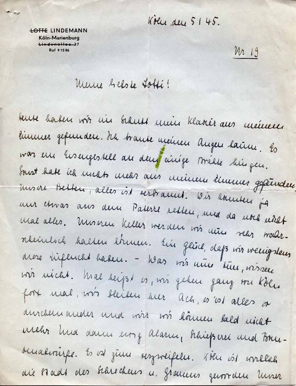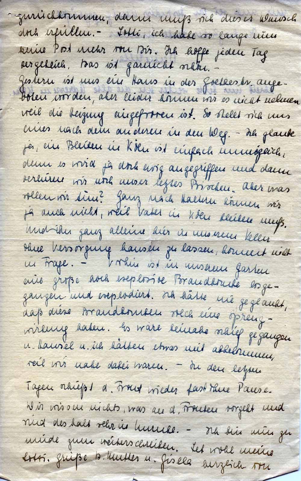 Gestern ist uns ein Haus in der Goethestr. angeboten worden, aber leider können wir es nicht nehmen weil die Heizung eingefroren ist. So stellt sich uns eines nach dem anderen in den Weg. – Ich glaube ja, ein Bleiben in Köln ist einfach unmöglich, denn es wird ja doch ewig angegriffen und dann verlieren wir noch unser letztes Bischen. Aber was sollen wir tun? Ganz nach Haltern können wir ja auch nicht, weil Vater in Köln bleiben muß. Und ihn ganz alleine hier in unserem Keller ohne Versorgung hausen zu lassen, kommt nicht in Frage. – Vorhin ist in unserem Garten eine große hoch explosive Brandbombe losgegangen und explodiert. Ich hätte nie geglaubt, daß diese Brandbomben solch eine Sprengwirkung haben. Es wäre beinahe schief gegangen u. Hansel u. ich hätten etwas mit abbekommen, weil wir nahe dabei waren. – In den letzten Tagen schießt d. Front wieder fast ohne Pause. Wir wissen nichts, was an d. Fronten vorgeht und sind deshalb sehr in Unruhe. – Ich bin nun zu müde zum weiterschreiben. Leb wohl meine Lotti. Grüße d. Mutter u. Gisela herzlich von