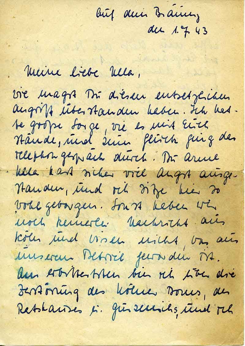 wie magst Du diesen entsetzlichen Angriff überstanden haben. Ich hatte große Sorge, wie es mit Euch stände, und zum Glück ging das Telephongespräch durch. Du arme Ulla hast sicher viel Angst ausgestanden, und ich sitze hier so wohl geborgen. Sonst haben wir noch keinerlei Nachricht aus Köln und Wisen[?] nicht, was aus unserem Betrieb geworden ist. Am erbittertsten bin ich über die Zerstörung des Kölner Doms, des Rathauses u. Gürzenichs, und ich