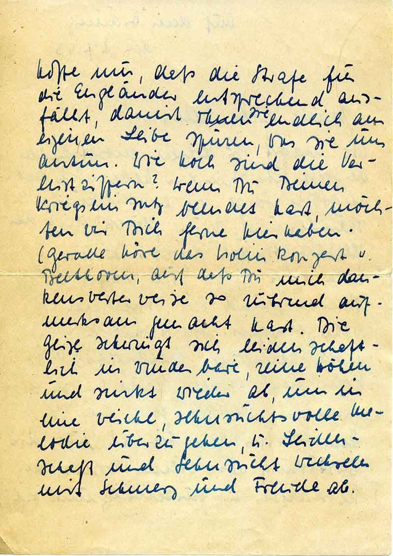 hoffe nur, daß die Strafe für die Engländer entsprechend ausfällt, damit sie endlich am eigenen Leibe spüren, was sie uns antun. Wie hoch sind die Verlustziffern? Wenn Du Deinen Kriegseinsatz beendet hast, möchten wir Dich gerne hier haben. (Gerade höre das Violinkonzert v. Beethoven, auf das Du mich dankenswerterweise so rührend aufmerksam gemacht hast. Die Geige schwingt sich leidenschaftlich in wunderbare, reine Höhen und sinkt wieder ab, um in eine weiche, sehnsuchtsvolle Melodie überzugehen, u. Leidenschaft und Sehnsucht wechseln mit Schmerz und Freude ab.