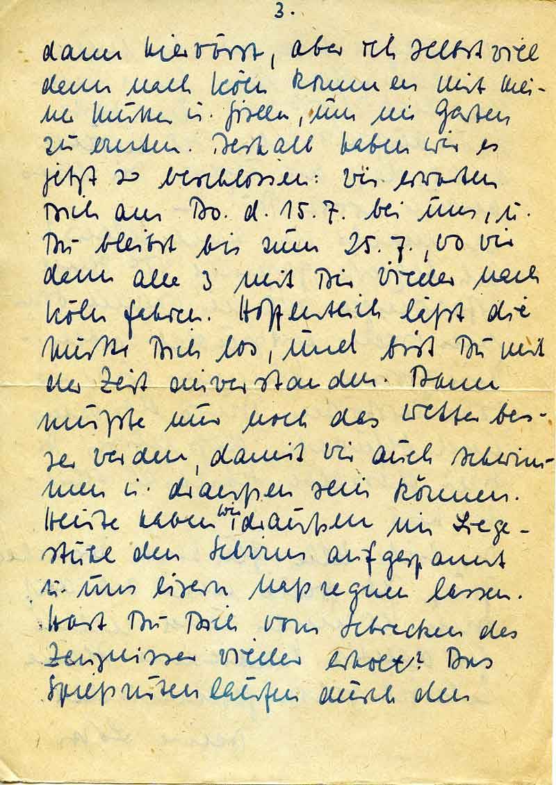 dann hierwärst, aber ich selbst will dann nach Köln kommen mit meiner Mutter u. Gisela, um im Garten zu ernten. Deshalb haben wir es jetzt so beschlossen: Wir erwarten Dich am Do. d. 15.7. bei uns, u. Du bleibst bis zum 25.7., wo wir dann alle 3 mit Dir wieder nach Köln fahren. Hoffentlich läßt die Mutter Dich los, und bist Du mit der Zeit einverstanden. Dann müßte nur noch das Wetter besser werden, damit wir auch schwimmen u. draußen sein können. Heute haben wir draußen im Liegestuhl den Schirm aufgespannt u. uns eisern naßregnen lassen. Hast Du Dich vom Schrecken des Zeugnisses wieder erholt? Das Spießrutenlaufen durch den