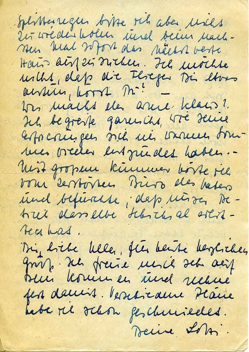 Was macht der arme Klaus? Ich begreife garnicht, wie seine Erfrierungen sich im warmen Sommer wieder entzündet haben. – Mit großem Kummer hörte ich vom zerstörten Büro des Vaters und befürchte, daß unser Betrieb dasselbe Schicksal erlitten hat.