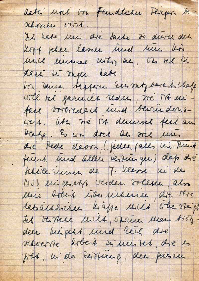 Von Deiner tapferen Einsatzbereitschaft will ich garnicht reden, sie ist einfach vorbildlich und bewundernswert. Aber sie ist dennoch fehl am Platze. Es war doch an sich nur die Rede davon, (jedenfalls im Rundfunk und allen Zeitungen) daß die Schülerinnen der 7. Klasse in der NSV eingesetzt werden sollten, also eine Arbeit übernehmen, die ihre tatsächlichen Kräfte nicht übersteigt. Ich verstehe nicht, warum man trotzdem hingeht und Euch die schwerste Arbeit zumutet, die es gibt, in der Rüstung, den ganzen