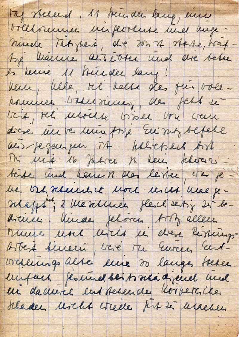 Tag stehend, 11 Stunden lang, eine vollkommen ungewohnte und ungesunde Tätigkeit, die sonst starke, kräftige Männer ausübten und die be[..] es keine 11 Stunden lang!