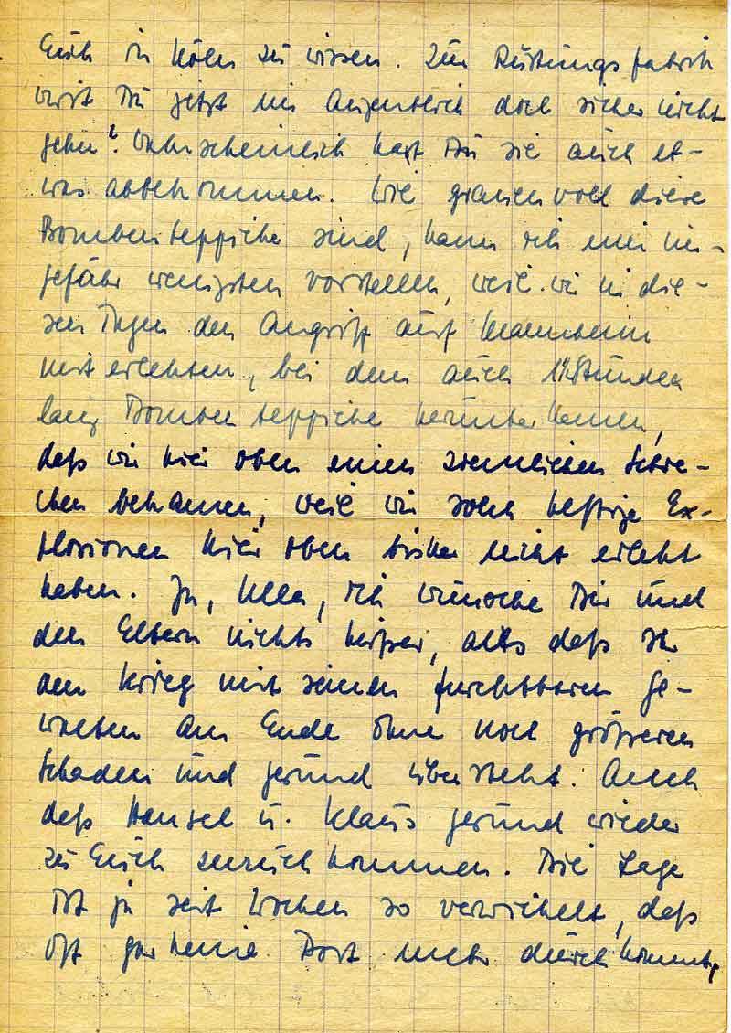 Euch in Köln zu wissen. Zur Rüstungsfabrik wirst Du jetzt im Augenblick doch sicher nicht gehen? Wahrscheinlich hat [..] sie auch etwas abbekommen. Wie grauenvoll diese Bombenteppiche sind, kann ich mir ungefähr wenigstens vorstellen, weil wir in diesen Tagen den Angriff auf Mannheim miterlebten, bei dem auch 1 ½ Stunden lang Bombenteppiche herunterkamen, daß wir hier oben einen ziemlichen Schrecken bekamen, weil wir solch heftige Explosionen hier oben bisher nicht erlebt haben. Ja, Ulla, ich wünsche Dir und den Eltern nichts heißer, als daß Ihr den Krieg mit seinen furchtbaren Gewalten am Ende ohne noch größeren Schaden und gesund übersteht. Auch daß Hansel u. Klaus gesund wieder zu Euch zurückkommen. Die Lage ist ja seit Wochen so verwickelt, daß oft gar keine Post mehr durchkommt,