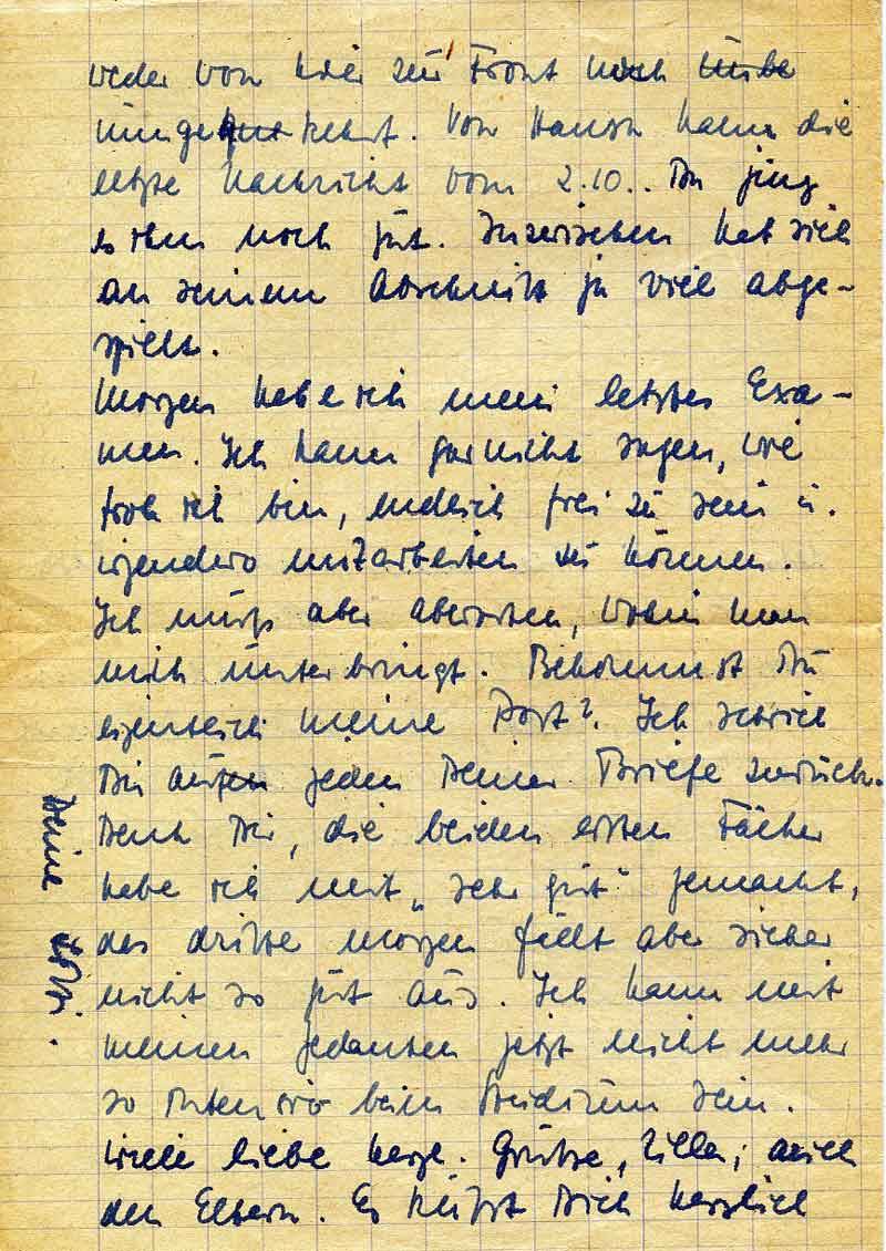 Morgen habe ich mein letztes Examen. Ich kann gar nicht sagen, wie froh ich bin, endlich frei zu sein u. irgendwo mitarbeiten zu können. Ich muß aber abwarten, wohin man mich unterbringt. Bekommst Du eigentlich meine Post? Ich schrieb Dir auf jeden Deiner Briefe zurück. Denk Dir, die beiden ersten Fächer habe ich mit „sehr gut“ gemacht, das dritte morgen fällt aber sicher nicht so gut aus. Ich kann mit meinen Gedanken jetzt nicht mehr so intensiv beim Studium sein.