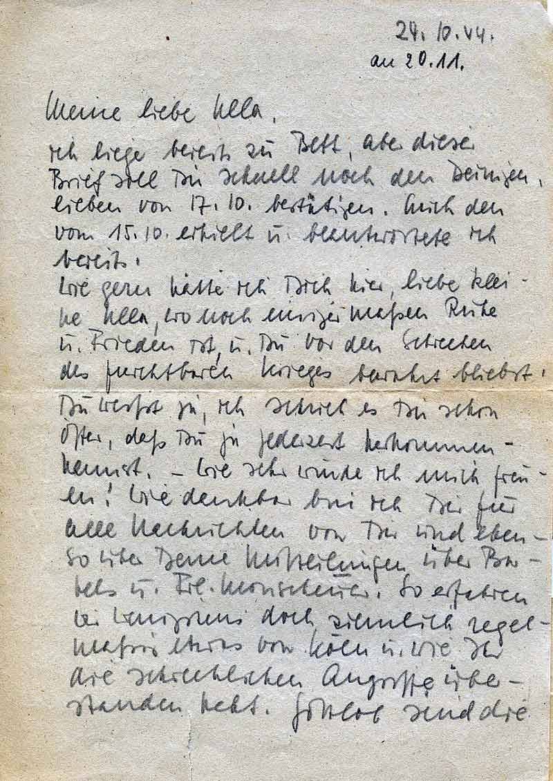 Wenn nicht von weitem die Front auch jetzt in der Nacht rummelte u. alles anders wäre, könnte ich mich darüber freuen. Um Hansa haben wir die größten Sorgen. Heute kam ein Brief vom 10.10., das sie aushalten müßen. Es denkt in herzlicher Liebe an Dich