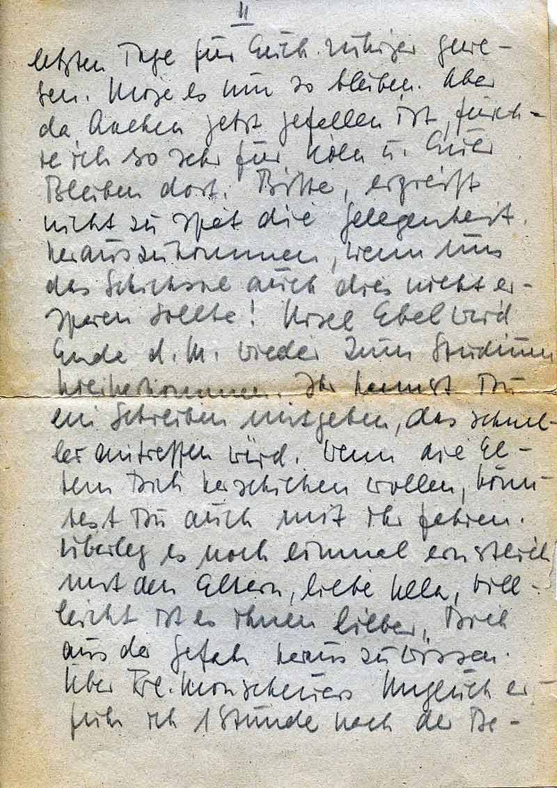 letzten Tage für Euch ruhiger geworden. Möge es nun so bleiben. Aber da Aachen jetzt gefallen ist, fürchte ich so sehr für Köln u. Euer Bleiben dort. Bitte, ergreift nicht zu spät die Gelegenheit herauszukommen, wenn uns das Schicksal auch dies nicht ersparen sollte! Ursel Ebel wird Ende d. M. wieder zum Studium hierherkommen. Ihr kannst Du ein Schreiben mitgeben, das schneller eintreffen wird. Wenn die Eltern Dich herschicken wollen, könntest Du auch mit ihr fahren. Überleg es noch einmal ernstlich mit den Eltern, liebe Ulla, vielleicht ist es ihnen lieber, Dich aus der Gefahr heraus zu wissen.