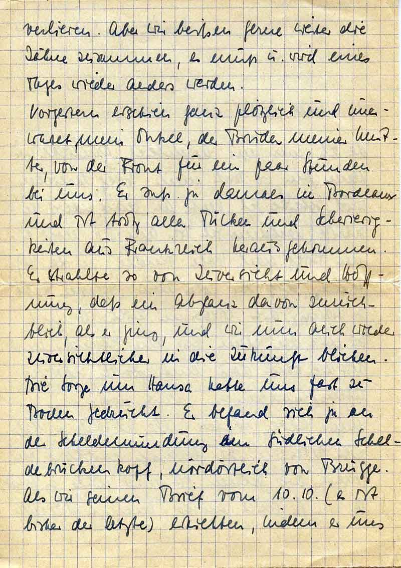 Vorgestern erschien ganz plötzlich und unerwartet mein Onkel, der Bruder meiner Mutter, von der Front für ein paar Stunden bei uns. Er saß ja damals in Bordeaux und ist trotz aller Tücken und Schwierigkeiten aus Frankreich herausgekommen. Er strahlte so von Zuversicht und Hoffnung, daß ein Abglanz davon zurückblieb, als er ging, und wir nun auch wieder zuversichtlicher in die Zukunft blicken. Die Sorge um Hansa hatte uns fast zu Boden gedrückt. Er befand sich ja an der Scheldemündung am südlichen Scheldebrückenkopf, nordöstlich von Brügge. Als wir seinen Brief vom 10.10. (es ist bisher der letzte) erhielten, indem er uns