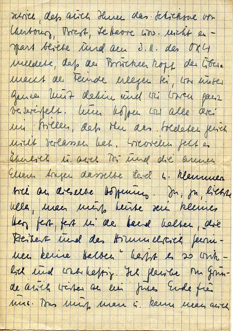 schrieb, daß auch Ihnen das Schicksal von Cherbourg, Brest, Le Havre usw. nicht erspart bliebe und am 3.11. das OKW meldete, daß der Brückenkopf der Übermacht der Feinde erlegen sei, war unser ganzer Mut dahin und wir waren ganz verzweifelt. Nun hoffen wir alle drei im Stillen, daß ihn das Soldatenglück nicht verlassen hat. Wievielen geht es ähnlich u. auch Du und die armen Eltern tragen dasselbe Leid u. klammern sich an dieselbe Hoffnung. Ja, ja, liebste Ulla, man muß heute sein kleines Herz fest, fest in der Hand halten, „die Freiheit und das Himmelreich gewinnen keine Halben“ heißt es so wirklich und wahrhaftig. Ich glaube im Grunde auch weiter an ein gutes Ende für uns. Das muß man u. kann man auch.