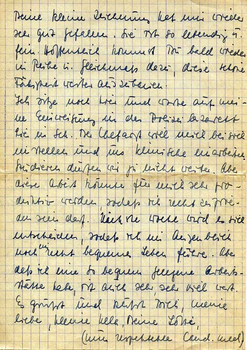 Ich sitze noch hier und warte auf meine Einweisung in das Polizeilazarett hier in Sch. Der Chefarzt will mich bei sich einstellen und ins Klinische einarbeiten. Studieren dürfen wir ja nicht weiter. Aber diese Arbeit könnte für mich sehr produktiv werden, sodaß ich recht zufrieden sein darf. Nächste Woche wird es sich entscheiden, sodaß ich im Augenblick noch ein recht bequemes Leben führe. Aber daß ich eine so bequem gelegene Arbeitsstätte habe, ist auch sehr, sehr viel wert. Es grüßt und küßt Dich, meine liebe, kleine Ulla, Deine Lotti,