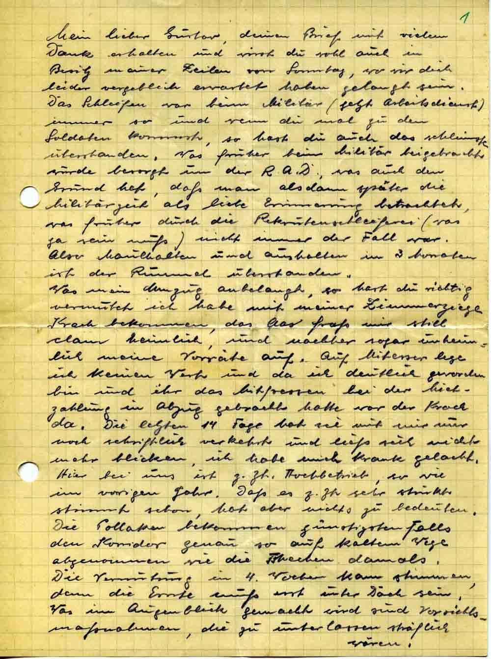 Mein lieber Gustav, deinen Brief mit vielem Dank erhalten und wirst du wohl auch in Besitz meiner Zeilen vom Sonntag, wo wir dich leider vergeblich erwartet haben gelangt sein. Das Schleifen war beim Militär (jetzt Arbeitsdienst) immer so und wenn du mal zu den Soldaten kommst, so hast du auch das schlimmste überstanden. Was früher beim Militär beigebracht wurde besorgt nun der R.A.D., was auch den Grund hat, daß man alsdann später die Militärzeit als liebe Erinnerung betrachtet, was früher durch die Rekrutenschleiferei (was ja sein muß) nicht immer der Fall war. Also Maulhalten und aushalten in 3 Monaten ist der Rummel überstanden.