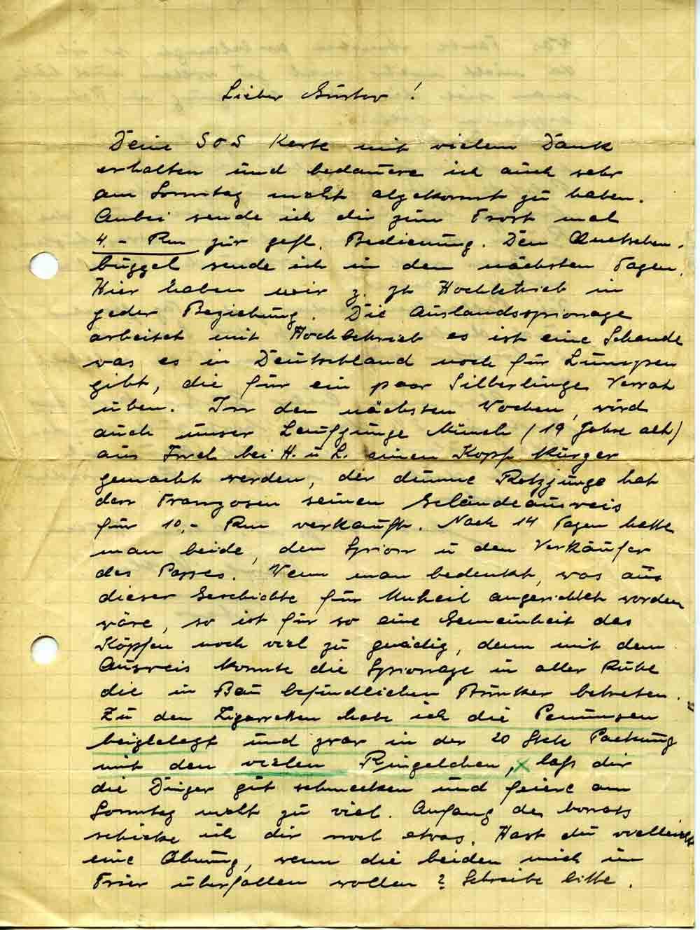 Deine SOS Karte mit vielem Dank erhalten und bedauere ich auch sehr am Sonntag nicht abgekonnt zu haben. Anbei sende ich dir zum Trost mal 4.- Rm zur gefl. Bedienung. Den Quetschenbüggel sende ich in den nächsten Tagen. Hier haben wir z. Zt. Hochbetrieb in jeder Beziehung. Die Auslandsspionage arbeitet mit Hochbetrieb es ist eine Schande was es in Deutschland noch für Lumpen gibt, die für ein paar Silberlinge Verrat üben. In den nächsten Wochen wird auch unser Laufjunge Münch (19 Jahre alt) aus Irrel bei H. u. L. einen Kopf kürzer gemacht werden, der dumme Rotzjunge hat den Franzosen seinen Geländeausweis für 10,- Rm verkauft. Nach 14 Tagen hatte man beide, den Spion u. den Verkäufer des Passes. Wenn man bedeutet, was aus dieser Geschichte für Unheil angerichtet worden wäre, so ist für so eine Gemeinheit das Köpfen noch viel zu gnädig, denn mit dem Ausweis konnte die Spionage in aller Ruhe die in Bau befindlichen Bunker betreten. Zu den Zigaretten habe ich die Penunsen beigelegt und zwar in der 20 Stck Packung mit den vielen Ringelchen, laß dir die Dinger gut schmecken und feiere am Sonntag nicht zu viel. Anfang des Monats schicke ich dir noch etwas. Hast du vielleicht eine Ahnung, wann die beiden mich in Trier überfallen wollen? Schreibe bitte.