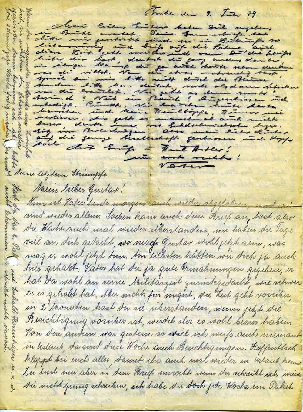 Nun ist Vater heute morgen auch schon wieder abgefahren, und wir sind wieder allein. Soeben kam auch dein Brief an, hast also die Woche auch mal wieder überstanden, wir haben die Tage viel an dich gedacht, wo mag Gustav wohl jetzt sein, was mag er wohl jetzt tun. Am liebsten hätten wir dich ja auch hier gehabt. Vater hat dir ja gute Ermahnungen gegeben, er hat da wohl an seine Militärzeit zurückgedacht, wie schwer er es gehabt hat. Aber nichts für ungut, die Zeit geht vorüber, in 2 Monaten hast du sie überstanden, wenn jetzt die Besichtigung vorüber ist, werdet ihr es wohl besser haben. Von den andern war gestern so viel ich weiß auch niemand in Urlaub, da sind diese Woche auch Besichtigungen. Hoffentlich klappt bei euch alles, damit ihr auch mal wieder in Urlaub kommt. Du tust mir aber in dem Brief unrecht wenn du schreibst ich würde dir nicht genug schreiben, ich habe dir doch jede Woche ein Paket