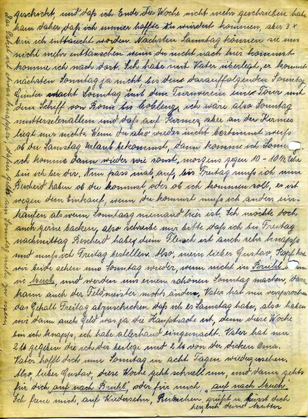 geschickt, und daß ich Ende der Woche nicht mehr geschrieben habe kam daher daß ich immer hoffte du würdest kommen, aber 3 x bin ich enttäucht worden. Nächsten Samstag können sie uns nicht mehr enttäuschen wenn du nicht nach hier kommst komme ich nach dort. Ich habe mit Vater überlegt, er kommt nächsten Sonntag ja nicht, bis den darauffolgenden Sonntag, Günter macht Sonntag mit dem Turnverein eine Tour mit dem Schiff von Bonn bis Coblenz, ich wäre also Sonntag mutterselenallein und daß auf Kirmes, aber an der Kirmes liegt mir nichts. Wenn du aber wieder nicht bestimmt weiß ob du Samstag Urlaub bekommst, dann komme ich Sonntag, ich komme dann wieder wie sonst, morgens gegen 10-10 ½ Uhr bin ich bei dir. Nun pass mal auf, bis Freitag muß ich nun Bescheid haben ob du kommst, oder ob ich kommen soll, es ist wegen dem Einkauf, wenn du kommst muß ich anders einkaufen als wenn Sonntag niemand hier ist. Ich möchte doch auch gerne backen, also schreibe mir bitte daß ich bis Freitag nachmittag Bescheid habe, denn Fleisch ist auch sehr knapp und muß ich Freitag bestellen. Also mein lieber Gustav, Kopf hoch, wir beide sehen uns Sonntag wieder, wenn nicht in Brühl dann in Much, und werden uns einen schönen Sonntag machen, daran kann auch der Feldmeister nichts ändern. Vater hat mir versprochen das Gehalt Freitag abzuschicken daß ich es Samstag habe, also haben wir dann auch Geld was ja die Hauptsache ist, denn diese Woche bin ich knapp, ich habe allerhand eingemacht. Vater hat mir 2 M gegeben die ich dir beilege und 2 M von der dicken Oma. Vater hofft dich nun Sonntag in acht Tagen wiederzusehen. Also, lieber Gustav, diese Woche geht schnell um, und dann gehts für dich „auf nach Brühl“, oder für mich „auf nach Much“.