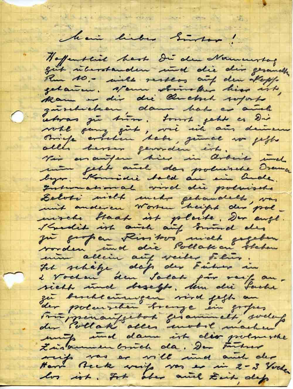 Ich schätze, daß der Führer in 2 Wochen den Salat für reif ansieht und besetzt. Um die Sache zu beschleunigen wird jetzt an der polnischen Grenze ein großes Truppenaufgebot gesammelt, sodaß der Pollak alles mobil machen muß und dann ist der polnische Zusammenbruch da. Der Führer weiß was er will und auch der Herr Beck weiß was er in 2-3 Wochen ist. Ist aber auch Zeit, daß