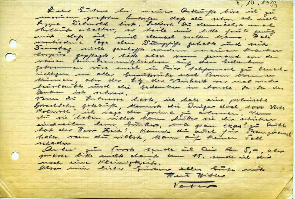 Toni Roos an Sohn Gustav, 7.Oktober 1939