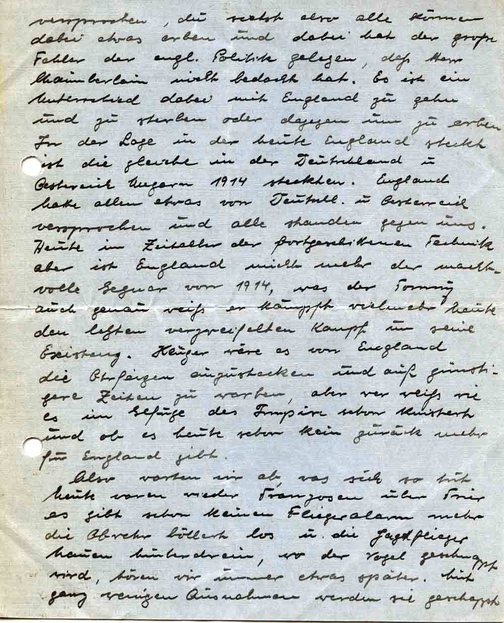 versprochen, du siehst also alle können dabei etwas erben und dabei hat der große Fehler der engl. Politik gelegen, daß Herr Chamberlain nicht bedacht hat. Es ist ein Unterschied dabei mit England zu gehn und zu sterben oder dagegen um zu erben. In der Lage in der heute England steckt ist die gleiche in der Deutschland u. Oesterreich Ungarn 1914 steckten. England hatte allen etwas von Deutschl. u. Oesterreich versprochen und alle standen gegen uns. Heute im Zeitalter der fortgeschrittenen Technik aber ist England nicht mehr der machtvolle Gegner von 1914, was der Tommy auch genau weiß er kämpft vielmehr heute den letzten verzweifelten Kampf um seine Existenz. Klüger wäre es von England die Ohrfeigen einzustecken und auf günstigere Zeiten zu warten, aber wer weiß wie es im Gefüge des Impire schon knistert und ob es heute schon kein zurück mehr für England gibt.