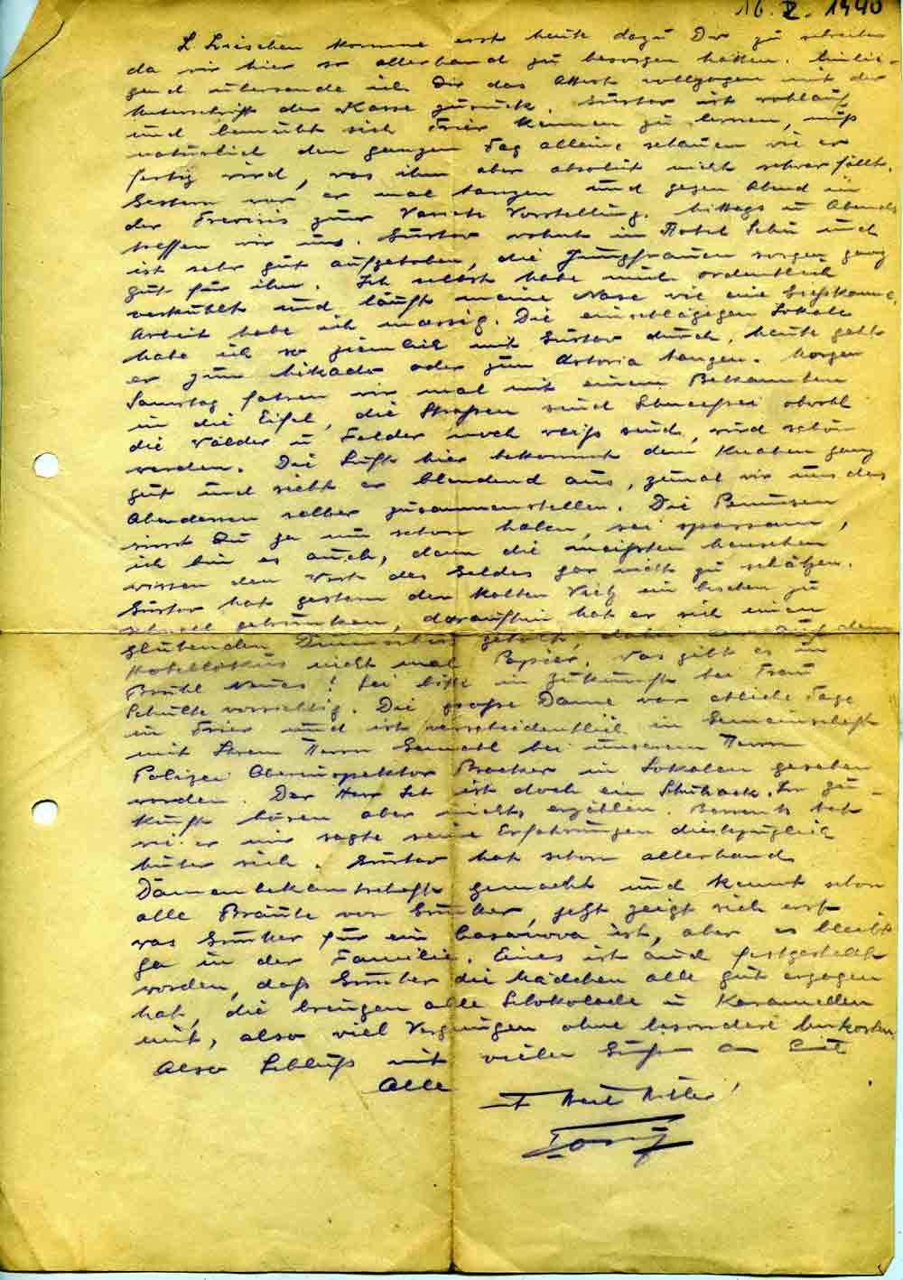 Toni Roos an seine Frau Elisabeth, 16. Februar 1940