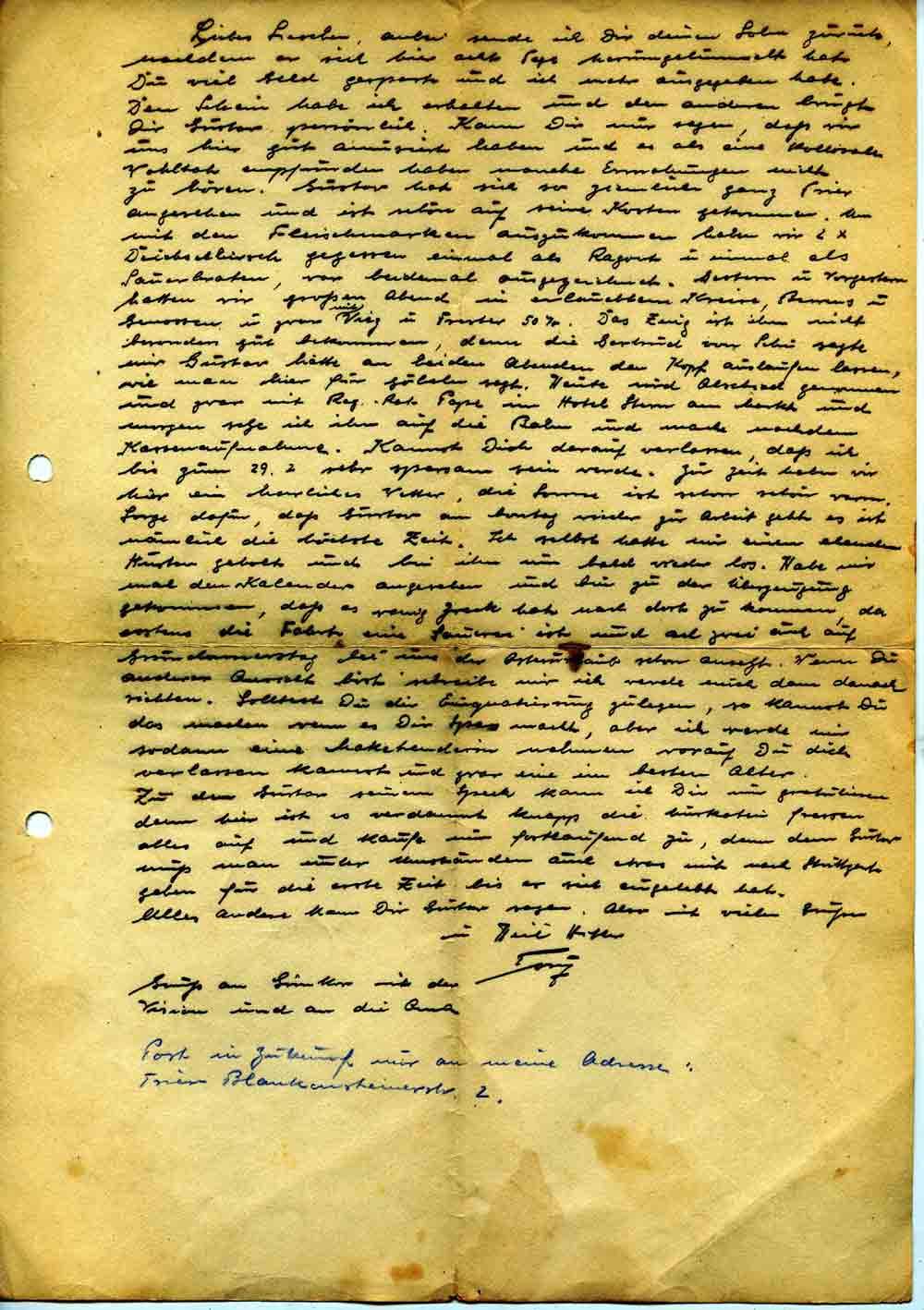 Liebes Lieschen, anbei sende ich Dir deinen Sohn zurück, nachdem er sich hier acht Tage herumgetummelt hat. Du viel Geld gespart und ich mehr ausgegeben habe. Den Schein habe ich erhalten und den anderen bringt Dir Gustav persönlich. Kann Dir nur sagen, daß wir uns hier gut amüsiert haben und es als eine [?] Wohltat empfunden haben manche Ermahnungen nicht zu hören. Gustav hat sich so ziemlich ganz Trier angesehen und ist schön auf seine Kosten gekommen. Um mit den Fleischmarken auszukommen haben wir 2 x Deichselhirsch gegessen einmal als Ragout u. einmal als Sauerbraten, war beidemal ausgezeichnet. Gestern u. Vorgestern hatten wir großen Abend in erlauchtem Kreise, Barens u. Genossen u. zwar mit [?] u. Trester 50 %. Das Zeug ist ihm nicht besonders gut bekommen, denn die Gertrud von Sebu sagte mir Gustav hätte an beiden Abenden den Kopf auslaufen lassen, wie man hier für solch sagt. Heute wird Abschied genommen und zwar mit Reg.Rat Pape im Hotel Stern am Markt und morgen sehe ich ihn auf die Bahn und mache nachdem Kassenaufnahme. Kannst Dich darauf verlassen, daß ich bis zum 29.2. sehr sparsam sein werde. Zur Zeit haben wir hier ein herrliches Wetter, die Sonne ist schon schön warm. Sorge dafür, daß Gustav am Montag wieder zur Arbeit geht es ist nämlich die höchste Zeit. Ich selbst hatte mir einen elenden Husten geholt und bin ihn nun bald wieder los. Habe mir mal den Kalender angesehen und bin zu der Überzeugung gekommen, daß es wenig Zweck hat nach dort zu kommen, da erstens die Fahrt eine Sauerei ist und mal zwei auch auf Gründonnerstag bei uns der Osterurlaub schon ansetzt. Wenn Du anderer Ansicht bist schreibe mir ich werde mich dann danach richten. Solltest Du dir Einquartierung zulegen, so kannst Du das machen wenn es Dir Spass macht, aber ich werde mir sodann eine Maketenderin nehmen worauf Du dich verlassen kannst und zwar eine im besten Alter.