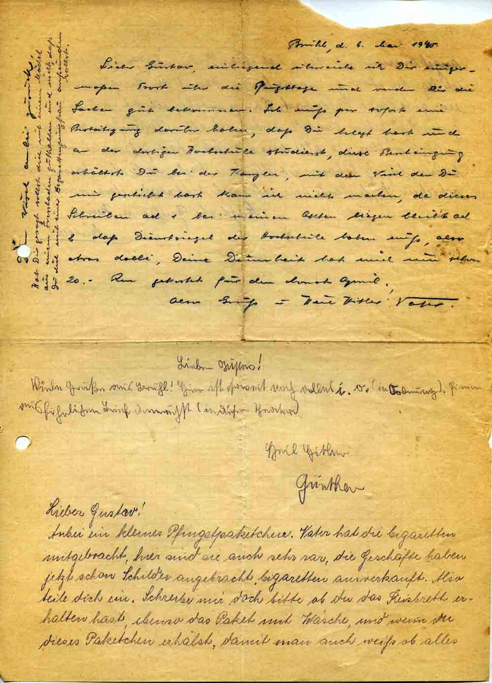 Lieber Gustav, einliegend überreiche ich Dir einigermaßen Trost über die Pfingsttage und werden Dir die Sachen gut bekommen. Ich muß per sofort eine Bestätigung darüber haben, daß Du belegt hast und an der dortigen Hochschule studierst, diese Bescheinigung erhältst Du bei der Kanzlei, mit dem Wisch den Du mir geschickt hast kann ich nichts machen, da dieses Schreiben ad 1 bei meinen Akten liegen bleibt ad 2 daß Dienstsiegel der Hochschule haben muß, also etwas dalli, Deine Dummheit hat mich nun schon 20,- Rm gekostet für den Monat April.