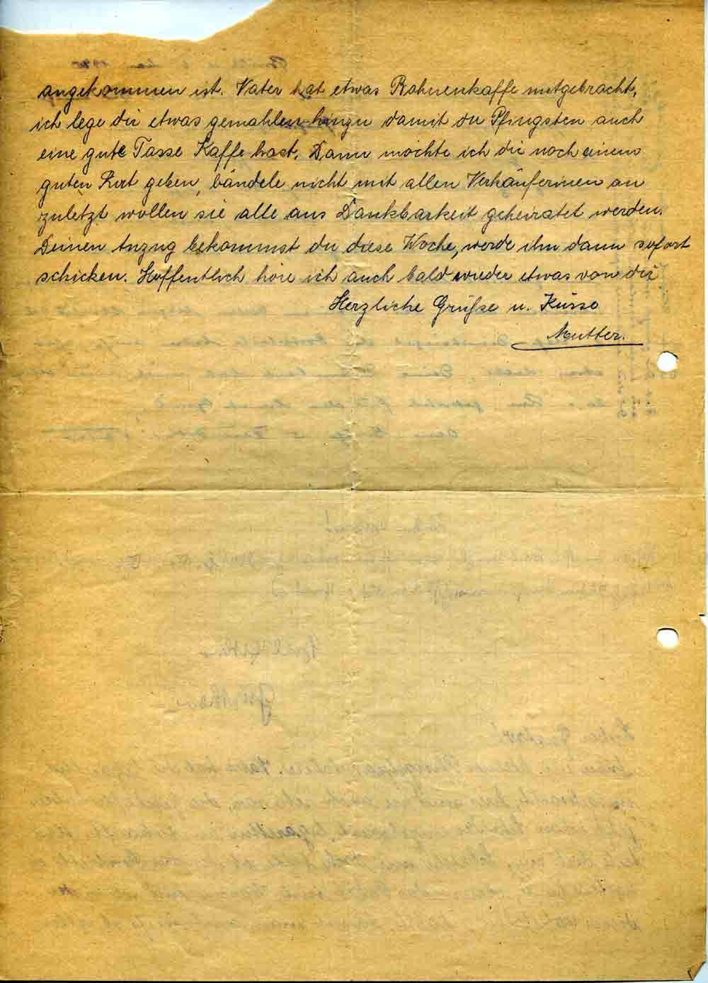 angekommen ist. Vater hat etwas Bohnenkaffe mitgebracht, ich lege dir etwas gemahlen hinzu damit du Pfingsten auch eine gute Tasse Kaffe hast. Dann möchte ich dir noch einen guten Rat geben, bändele nicht mit allen Verkäuferinnen an zuletzt wollen sie alle aus Dankbarkeit geheiratet werden. Deinen Anzug bekommst du diese Woche, werde ihn dann sofort schicken. Hoffentlich höre ich auch bald wieder etwas von dir.