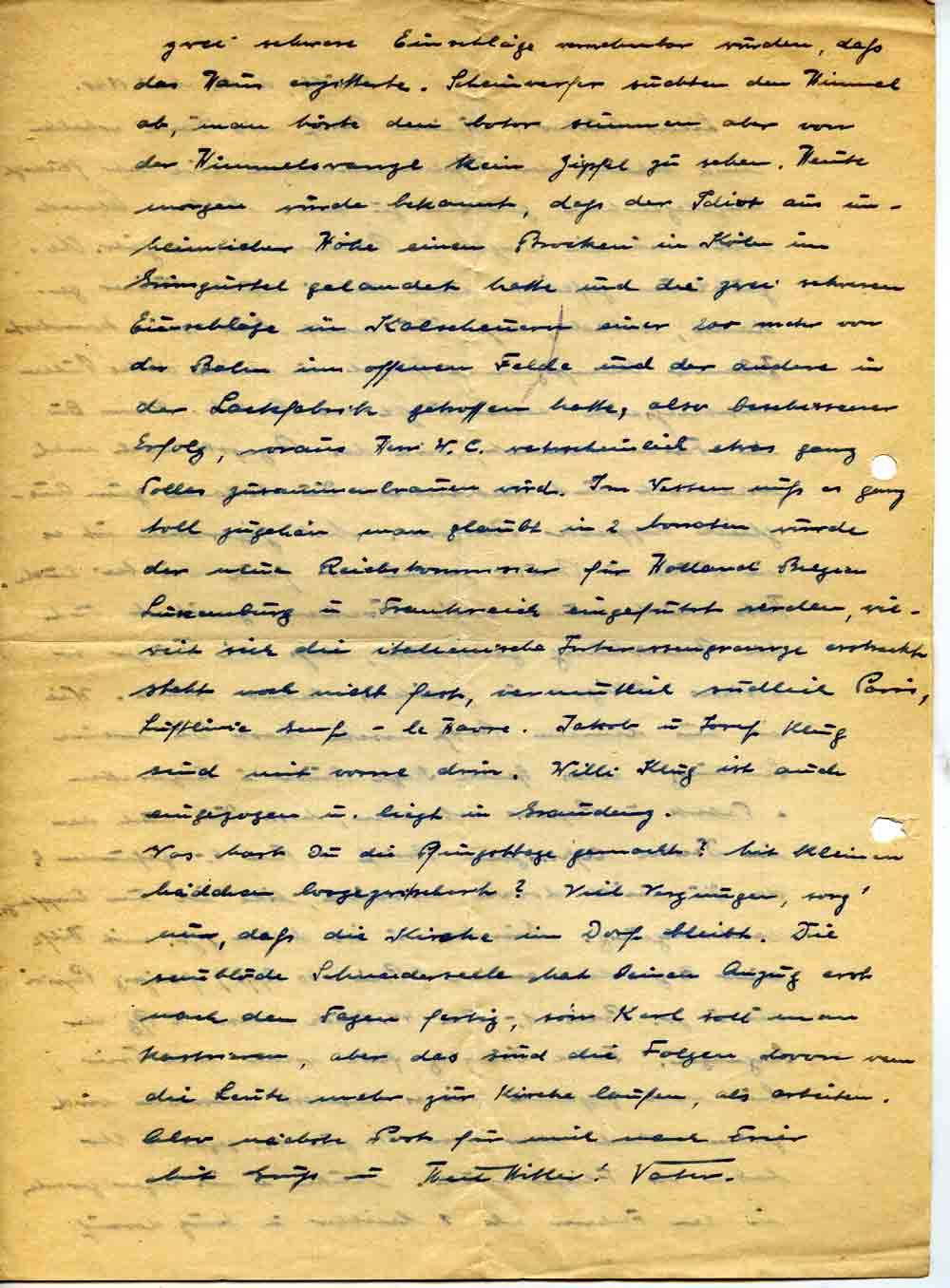 zwei schwere Einschläge vernehmbar wurden, daß das Haus erzitterte. Scheinwerfer suchten den Himmel ab, man hörte den Motor summen aber von der Himmelswanze kein Zippel zu sehen. Heute morgen wurde bekannt, daß der Idiot aus unheimlicher Höhe einen Brocken in Köln im Grüngürtel gelandet hatte und die zwei schweren Einschläge in Kalscheuern einer 200 meter von der Bahn im offenen Felde und der andere in der Lackfabrik getroffen hatte, also beschissener Erfolg, voraus Herr W. C. wahrscheinlich etwas ganz Tolles zusammenbrauen wird. Im Westen muß es ganz toll zugehen man glaubt in 2 Monaten würde der neue Reichskommissar für Holland Belgien Luxemburg u. Frankreich eingeführt werden, wieweit sich die italienische Interessengrenze erstreckt steht noch nicht fest, vermutlich südlich Paris, Luftlinie Genf – le Havre. Jakob u. Josef Klug sind mit vorne drin. Willi Klug ist auch eingezogen u. liegt in Graudenz.