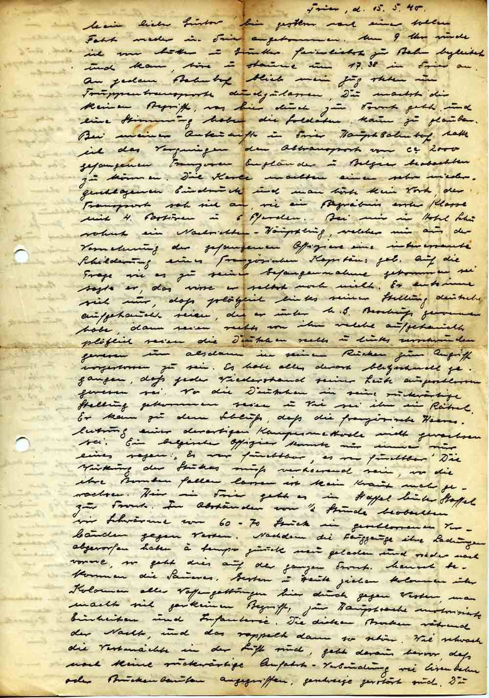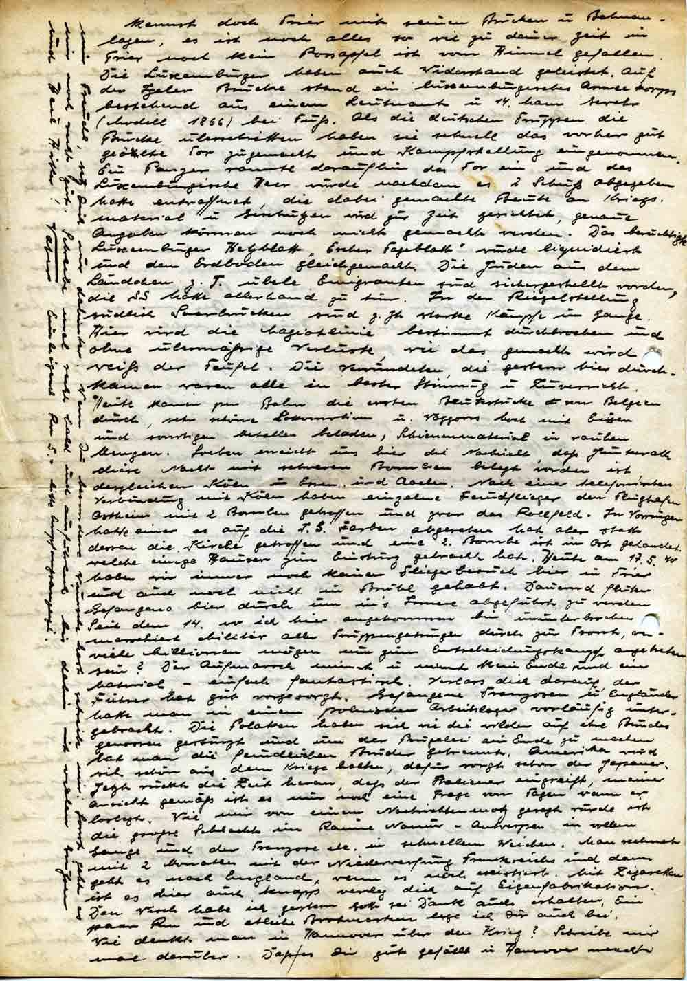 Mein lieber Gustav! bin gestern nach einer tollen Fahrt wieder in Trier angekommen. Um 9 Uhr wurde ich von Mutter u. Günther feierlichst zur Bahn begleitet und kam, höre u. staune um 17.38 in Trier an. An jedem Bahnhof blieb mein Zug stehen um Truppentransporte durchzulassen, Du machst dir keinen Begriff, was hier durch zur Front geht und eine Stimmung haben die Soldaten, kaum zu glauben. Bei meiner Ankunft in Trier Hauptbahnhof hatte ich das Vergnügen den Abtransport von ca. 2000 gefangenen Franzosen Engländer u. Belgier beobachten zu können. Die Kerle machten einen sehr niedergeschlagenen Eindruck und man hörte kein Wort, der Transport sah sich an, wie ein Begräbnis erster Klasse mit 4. Pastören u. 6 Pferden. Bei mir im Hotel Sebu wohnt ein Nachrichten-Häuptling, welcher mir aus der Vernehmung der gefangenen Offiziere eine interessante Schilderung eines französischen Kapitäns gab. Auf die Frage wie es zu seiner Gefangennahme gekommen sei sagte er, das wisse er selbst noch nicht. Er entsinne sich nur, daß plötzlich links seiner Stellung deutsche aufgetaucht seien, die er unter M.G. Beschuß genommen habe, dann seien rechts von ihm welche aufgetaucht plötzlich seien die Deutschen rechts u. links verschwunden gewesen um alsdann in seinem Rücken zum Angriff vorgestossen zu sein. Es habe alles derart blitzschnell gegangen, daß jeder Wiederstand seiner Leute ausgeschlossen gewesen sei. Wo die Deutschen in seine rückwärtige Stellung gekommen seien u. wie sei ihm ein Rätsel. Er kam zu dem Schluß, daß die französische Heeresleitung einer derartigen Kampesmethode nicht gewachsen sei. Ein belgischer Offizier konnte nur immer nur eines sagen: „Es war furchtbar, es war furchtbar“. Die Wirkung der Stukas muß verheerend sein, wo die ihre Bomben fallen lassen ist kein Kraut mehr gewachsen. Hier in Trier geht es in Staffel hinter Staffel zur Front. In Abständen von ½ Stunde beobachten wir Schwärme von 60-70 Stück in geschlossenen Verbänden gegen Westen. Nachdem die Flugzeuge ihre Ladungen abgeworfen haben à tempo zurück neu geladen und wieder nach vorne, so geht dies auf der ganzen Front. Mensch bekommen die Saueres. Gestern u. Heute ziehen Kolonnen über Kolonnen aller Waffengattungen hier durch gegen Westen, man macht sich gar keinen Begriff, zur Hauptsache motorisierte Einheiten und Infanterie. Die dicken Brocken während der Nacht, und das rappelt dann so schön. Wie schwach die Westmächte in der Luft sind, geht daraus hervor, daß noch keine rückwärtige Anfahrt-Verbindung wie Eisenbahn oder Brückenbauten angegriffen, geschweige zerstört sind. Du