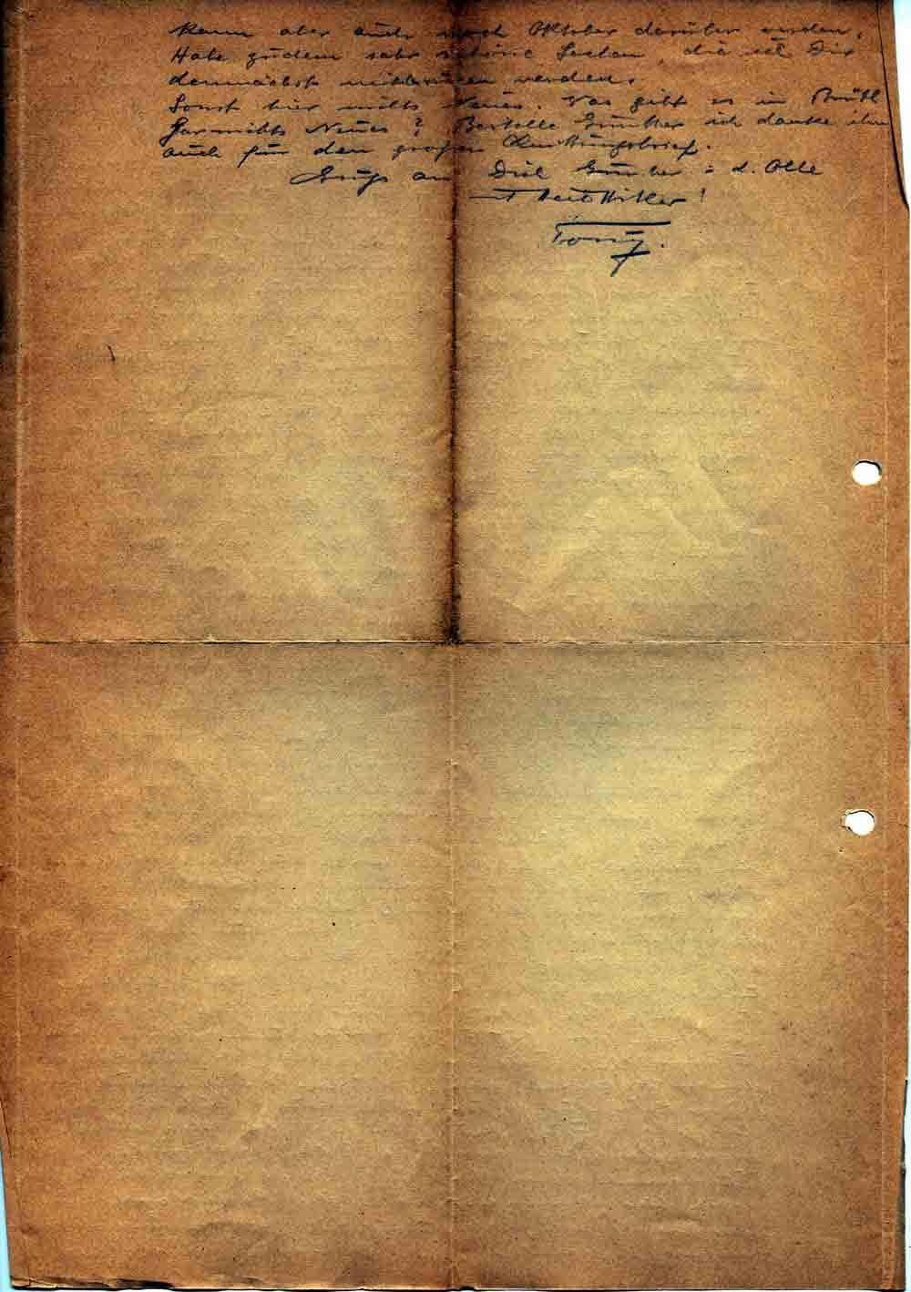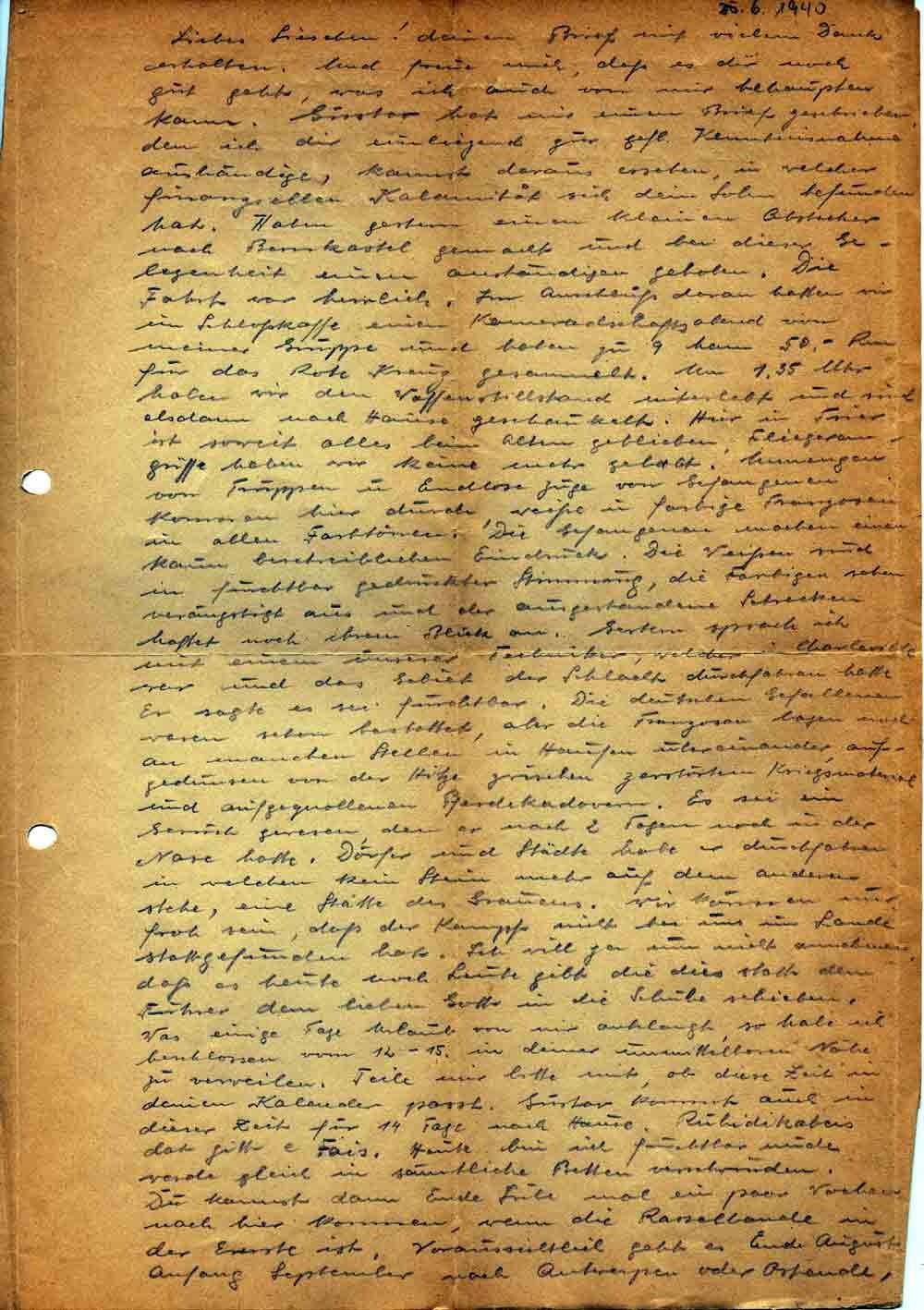 Liebes Lieschen! deinen Brief mit vielem Dank erhalten. Und freue mich, daß es dir noch gut geht, was ich auch von mir behaupten kann. Gustav hat mir einen Brief geschrieben den ich dir einliegend zur gefl. Kenntnisnahme aushändige, kannst daraus ersehen, in welcher finanziellen Kalamität sich dein Sohn befunden hat. Haben gestern einen kleinen Abstecher nach Bernkastel gemacht und bei dieser Gelegenheit einen anständigen gehoben. Die Fahrt war herrlich. Im Anschluß daran hatten wir im Schloßkaffe einen Kameradschaftsabend von meiner Gruppe und haben zu 9 Mann 50,- Rm für das Rote Kreuz gesammelt. Um 1.35 Uhr haben wir den Waffenstillstand miterlebt und sind alsdann nach Hause geschaukelt. Hier in Trier ist soweit alles beim Alten geblieben. Fliegerangriffe haben wir keine mehr behabt. Unmengen von Truppen u. Endlose Züge von Gefangenen kommen hier durch, weiße u. farbige Franzosen in allen Farbtönen. Die Gefangenen machen einen kaum beschreiblichen Eindruck. Die Weißen sind in furchtbar gedrückter Stimmung, die Farbigen sehen verängstigt aus und der ausgestandene Schrecken haftet noch ihrem Blick an. Gestern sprach ich mit einem unserer Techniker, welcher in Charleville war und das Gebiet der Schlacht durchfahren hatte. Er sagte es sei furchtbar. Die deutschen Gefallenen waren schon bestattet, aber die Franzosen lagen noch an manchen Stellen in Haufen übereinander, aufgedunsen von der Hitze zwischen zerstörten Kriegsmaterial und aufgequollenen Pferdekadavern. Es sei ein Geruch gewesen, den er nach 2 Tagen noch in der Nase hatte. Dörfer und Städte habe er durchfahren in welchen kein Stein mehr auf dem anderen stehe, eine Stätte des Grauens. Wir können nur froh sein, daß der Kampf nicht bei uns im Lande stattgefunden hat. Ich will ja nun nicht annehmen, daß es heute noch Leute gibt die dies statt dem Führer dem lieben Gott in die Schuhe schieben. Was einige Tage Urlaub von mir anbelangt, so habe ich beschlossen vom 12.-15. in deiner unmittelbaren Nähe zu verweilen. Teile mir bitte mit, ob diese Zeit in deinen Kalender passt. Gustav kommt auch in dieser Zeit für 14 Tage nach Hause. Rubidikabais dat gitt e Fais. Heute bin ich fruchtbar müde werde gleich in sämtliche Betten verschwinden. Du kannst dann Ende Juli mal ein paar Wochen nach hier kommen, wenn die Rasselbande in der Ernte ist. Voraussichtlich geht es Ende August Anfang September nach Antwerpen oder Ostende,