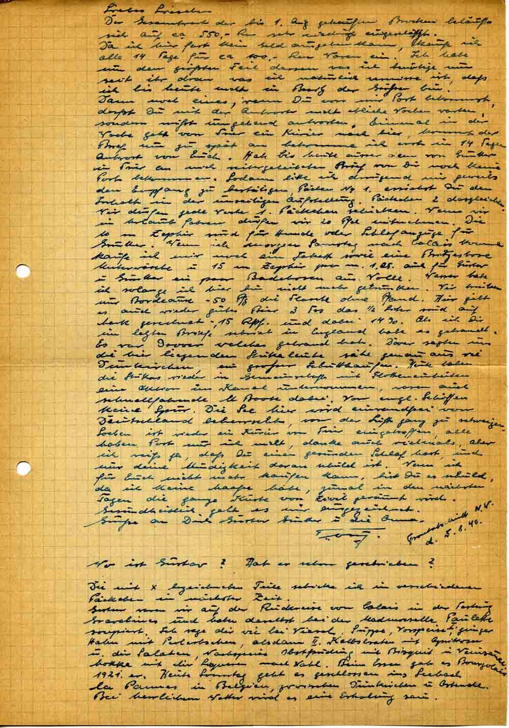 Dann noch eines, wenn Du von mir Post bekommst, darfst Du mit der Antwort nicht etliche Wochen warten, sondern mußt umgehend antworten. Einmal in der Woche geht von Trier ein Kurier nach hier, kommt der Brief nun zu spät an bekomme ich erst in 14 Tagen Antwort von Euch. Habe bis heute ausser dem von Günther in Trier an mich weitergeleiteten Brief von Dir noch keine Post bekommen. Sodann bitte ich dringend mir jeweils den Empfang zu bestätigen, Päcken No. 1. ersiehst Du den Inhalt in der umseitigen Aufstellung. Päckchen 2 desgleichen. Wir dürfen jede Woche 1. Päckchen schicken. Wenn wir in Urlaub fahren dürfen wir 20 Pfd. mitnehmen. Die 10 m Zephir sind für Hemde oder Schlafanzüge für Günther. Wenn ich morgen Samstag nach Calais komme kaufe ich mir noch ein Jakett sowie eine Bridgestore Unterwäsche u. 15 m Zephir pro m. 1,25. auch für Gustav u. Günther ein paar Badehosen aus Wolle. Wasser habe ich solange ich hier bin nicht mehr getrunken. Wir trinken nur Bordeaux -50 Pfg. die Flasche ohne Pfand. Hier gibt es auch wieder gutes Bier 3 Frs. das ½ Liter sind auf Mark gerechnet -,15 Rpf. und dabei 14 90[?]. Als ich Dir im letzten Briefe schrieb in England habe es gebrandt. Es war Dover welches gebrand hat. Döver sagten uns die hier liegenden Stukaleute sähe genau aus wie Dünkirchen, ein großer Schutthaufen. Heute haben die Stukas wieder in Gemeinschaft mit Flotteneinheiten eine Aktion im Kanal unternommen, waren auch schnellfahrende U Boote dabei. Von engl. Schiffen keine Spur. Die See hier wird einwandfrei von Deutschland beherrscht, von der Luft ganz zu schweigen. Soeben ist wieder ein Kurier von Trier eingetroffen, alle haben Post nur ich nicht, danke auch vielmals, aber ich weiß ja, daß Du einen gesunden Schlaf hast, und nur deine Müdigkeit daran schuld ist. Wenn ich für Euch nicht mehr kaufen kann, bist Du es schuld, da ich keine Maße habe, zumal in den nächsten Tagen die ganze Küste von Zivil geräumt wird.