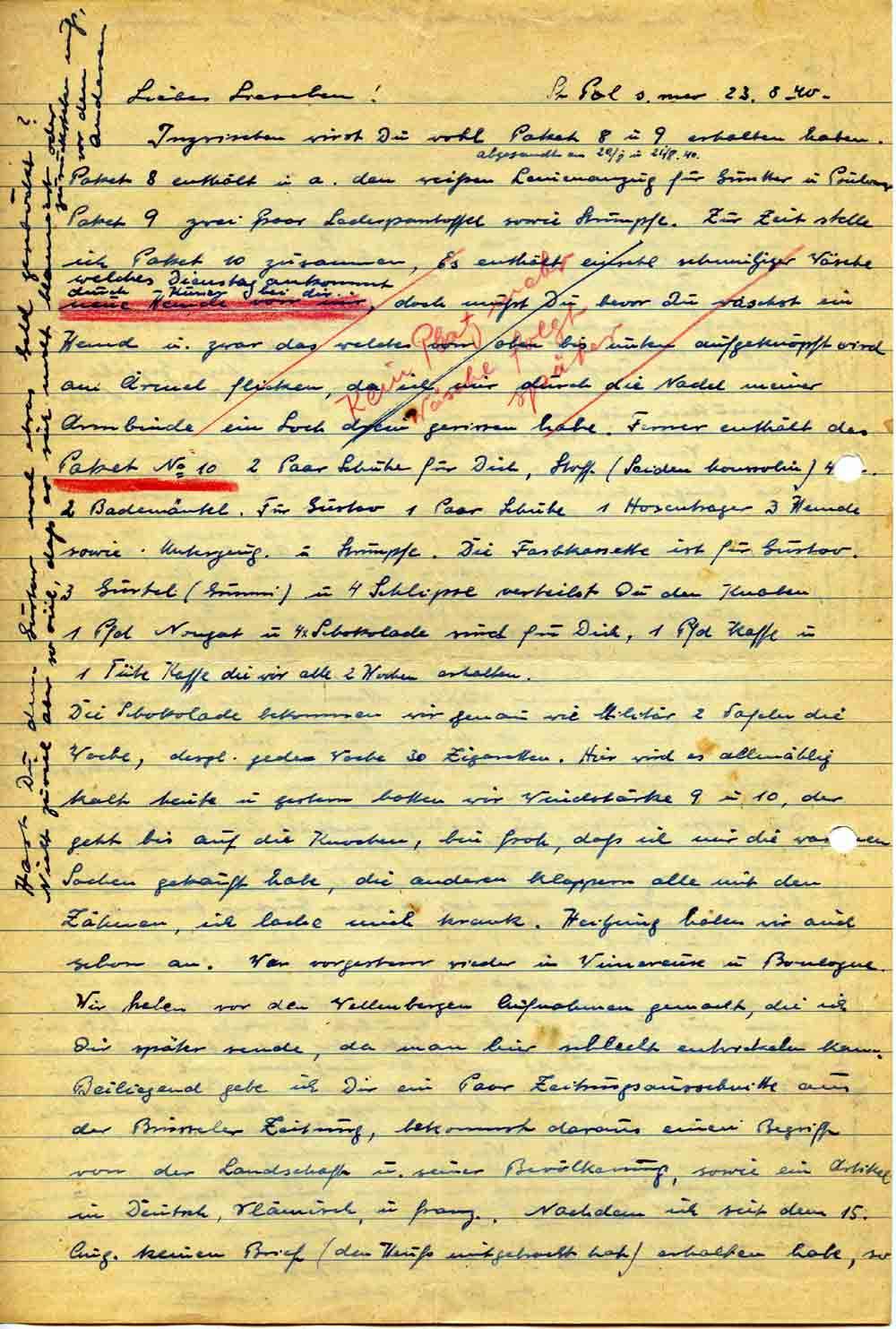 Inzwischen wirst Du wohl Pakete 8 u. 9 (abgesandt am 20/8. u. 21./8.40) erhalten haben. Paket 8 enthält u. a. den weißen Leinenanzug für Günther u. Poulover. Paket 9 zwei Paar Lederpantoffel sowie Strümpfe. Es enthält einschl. schmutziger Wäsche (in Rot: Kein Platz mehr Wäsche folgt später) welches Dienstag ankommt durch Kurier bei dir neue Hemde von mir, doch mußt Du bevor Du wäschst ein Hemd u. zwar das welches von oben bis unter aufgeknöpft wird am Ärmel flicken, da ich mir durch die Nadel meiner Armbinde ein Loch drein gerissen habe. Ferner enthält das Paket No. 10 2 Paar Schuhe für Dich, Stoff (Seiden Moussolin) 4[..]. 2 Bademäntel. Für Gustav 1 Paar Schuhe 1 Hosenträger 3 Hemde sowie Unterzeug u. Strümpfe. Die Farbkassette ist für Gustav. 3 Gürtel (Gummi) u. 4 Schlipse verteilst Du den Knaben 1 Pfd Nougat u. 4 x Schokolade sind für Dich, 1 Pfd Kaffe u. 1 Tüte Kaffe die wir alle 2 Wochen erhalten.