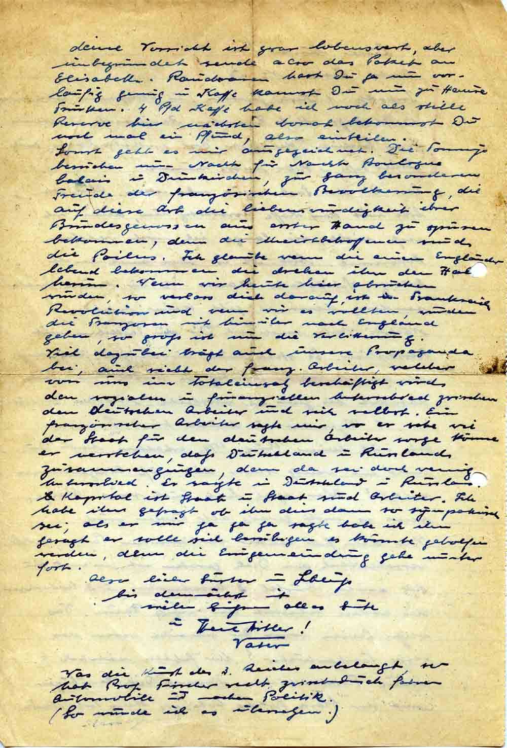 Sonst geht es mir ausgezeichnet. Die Tommys besuchen nun Nacht für Nacht Boulogne Calais u. Dünkirchen, zur ganz besonderen Freude der französischen Bevölkerung, die auf die Art die liebenswürdigkeit ihrer Bundesgenossen aus erster Hand zu spüren bekommen, denn die Meistbetroffenen sind die Poilus. Ich glaube wenn die einen Engländer lebend bekommen die drehen ihm den hals herum. Wenn wir heute hier abrücken würden, so verlass dich darauf ist in Frankreich Revolution und wenn wir es wollten, würden die Franzosen mit hinüber nach England gehen, so groß ist nun die Verbitterung. Viel dazubei trägt auch unsere Propaganda bei, auch sieht der franz. Arbeiter, welcher von uns im Totaleinsatz beschäftigt wird, den sozialen u. finanziellen Unterschied zwischen den deutschen Arbeiter und sich selbst. Ein französischer Arbeiter sagte mir, wo er sehe wie der Staat für den deutschen Arbeiter sorge könne er verstehen, daß Deutschland u. Russland zusammengingen, denn da sei doch wenig Unterschied. Er sagte in Deutschland u. Russland Kapital ist Staat u. Staat sind Arbeiter. Ich habe ihn gefragt ob ihm dies dann so sympathisch sei, als er mir ja ja ja sagte habe ich ihm gesagt er solle sich beruhigen es könnte geholfen werden, denn die Eingemeindung gehe munter fort.