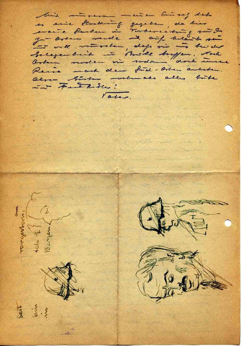 Mit unserem neuen Einsatz hat es eine Stockung gegeben, da hier neue Sachen in Vorbereitung sind. Zu Ostern werde ich auf Urlaub sein und will wünschen, daß wir uns bei der Gelegenheit in Brühl treffen. Nach Ostern werden wir sodann doch unsere Reise nach dem Süd-Osten antreten. Also Gustav nochmals alles Gute und Heil Hitler!