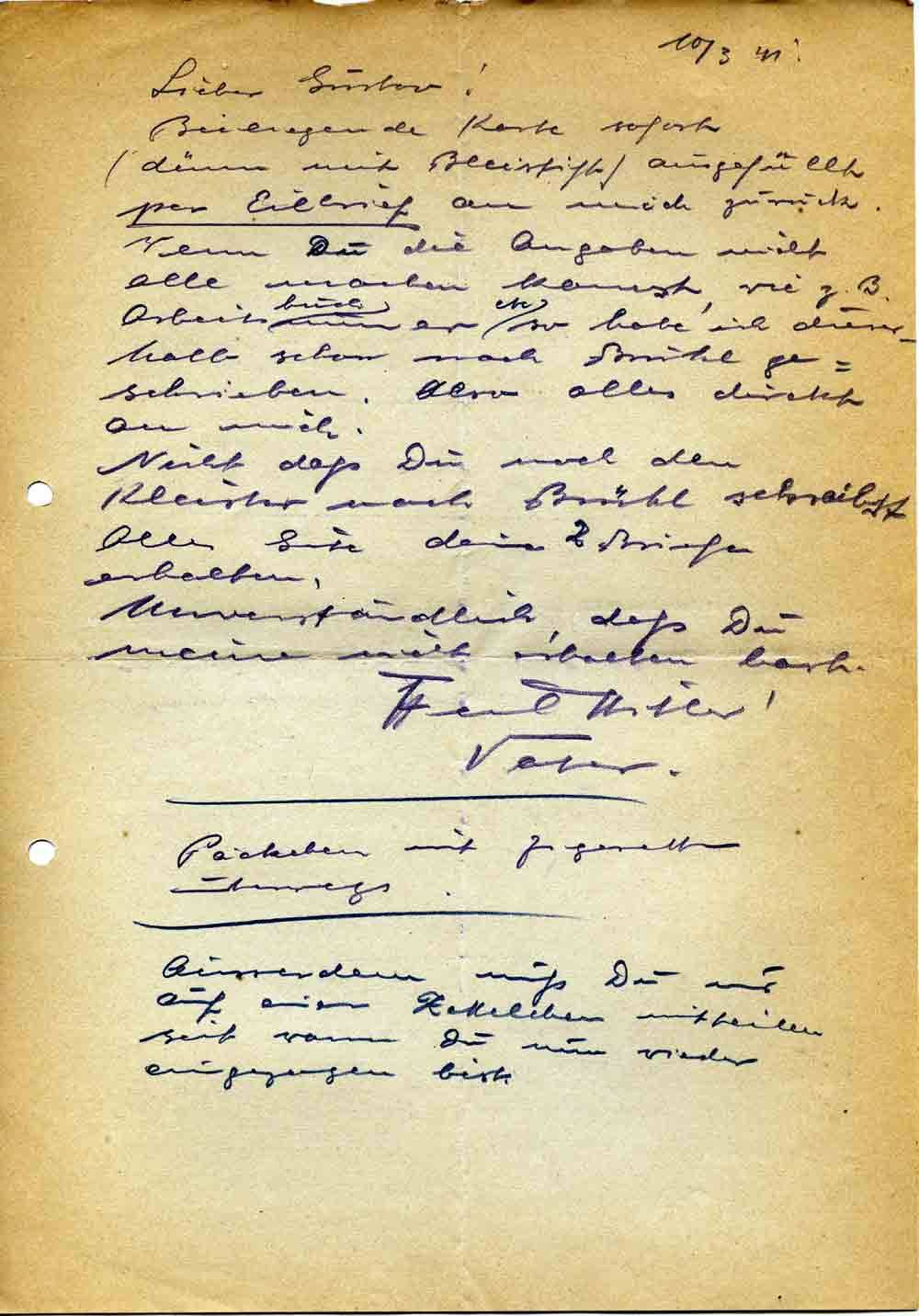 Beiliegende Karte sofort (dünn mit Bleistift) ausgefüllt per Eilbrief an mich zurück. Wenn Du die Angaben nicht alle machen kannst, wie z. B. Arbeitsbuchnummer etc. so habe ich dieserhalb schon nach Brühl geschrieben. Also alles direkt an mich.
