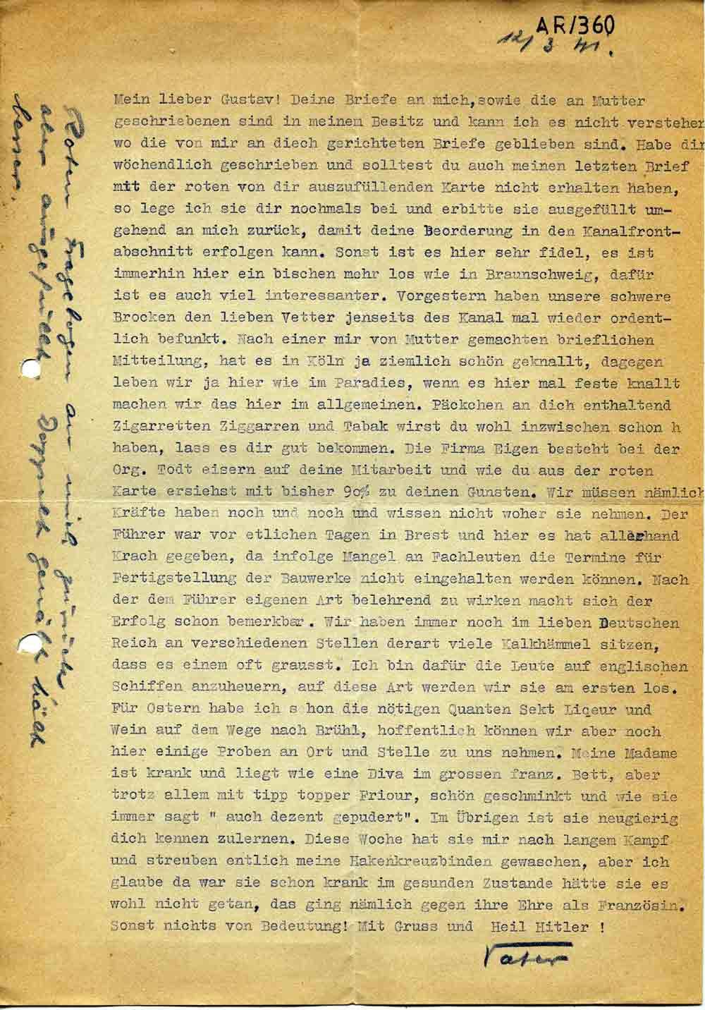 Mein lieber Gustav! Deine Briefe an mich, sowie die an Mutter geschriebenen sind in meinem Besitz und kann ich es nicht verstehen wo die von mir an Dich gerichteten Briefe geblieben sind. Habe dir wöchendlich geschrieben und solltest du auch meinen letzten Brief mit der roten von dir auszufüllenden Karte nicht erhalten haben, so lege ich sie dir nochmals bei und erbitte sie ausgefüllt umgehend an mich zurück, damit deine Beorderung in den Kanalfrontabschnitt erfolgen kann. Sonst ist es hier sehr fidel, es ist immerhin hier ein bischen mehr los wie ich Braunschweig, dafür ist es auch viel interessanter. Vorgestern haben unsere schwere Brocken den lieben Vetter jenseits des Kanal mal wieder ordentlich befunkt. Nach einer mir von Mutter gemachten brieflichen Mitteilung, hat es in Köln ja ziemlich schön geknallt, dagegen leben wir ja hier wie im Paradies, wenn es hier mal feste knallt machen wir das hier im allgemeinen. Päckchen an dich enthaltend Zigaretten Ziggarren und Tabak wirst du wohl inzwischen schon haben, lass es dir gut bekommen. Die Firma Eigen besteht bei der Org. Todt eisern auf deine Mitarbeit und wie du aus der roten Karte ersiehst mit bisher 90 % zu deinen Gunsten. Wir müssen nämlich Kräfte haben noch und noch und wissen nicht woher sie nehmen. Der Führer war vor etlichen Tagen in Brest und hier es hat allerhand Krach gegeben, da infolge Mangel an Fachleuten die Termine für Fertigstellung der Bauwerke nicht eingehalten werden können. Nach der dem Führer eigenen Art belehrend zu wirken macht sich der Erfolg schon bemerkbar. Wir haben immer noch im lieben Deutschen Reich an verschiedenen Stellen derart viele Kalkhämmel sitzen, dass es einem oft grausst. Ich bin dafür die Leute auf englischen Schiffen anzuheuern, auf diese Art werden wir sie am ersten los. Für Ostern habe ich schon die nötigen Quanten Sekt Liqeur und Wein auf dem Wege nach Brühl, hoffentlich können wir aber noch hier einige Proben an Ort und Stelle zu uns nehmen. Meine Madame ist krank und liegt wie eine Diva im grossen franz. Bett, aber trotz allem mit tipp topper Frisur, schön geschminkt und wie sie immer sagt „auch dezent gepudert“. Im Übrigen ist sie neugierig dich kennen zulernen. Diese Woche hat sie mir nach langem Kampf und streuben entlich meine Hakenkreuzbinde gewaschen, aber ich glaube da war sie schon krank im gesunden Zustande hätte sie es wohl nicht getan, das ging nämlich gegen ihre Ehre als Französin. Sonst nichts von Bedeutung! Mit Gruss und Heil Hitler!