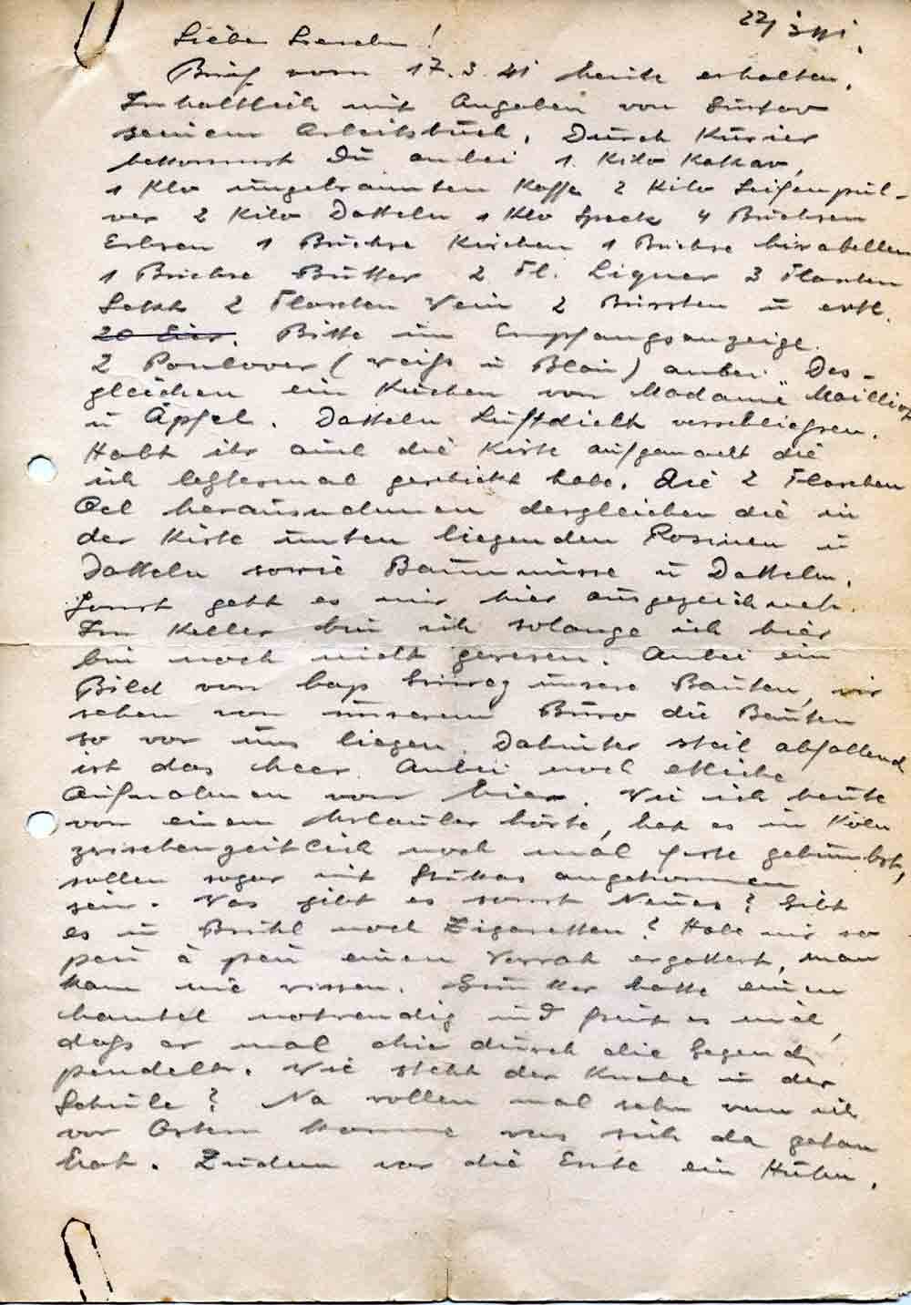 Brief vom 17.3.41 heute erhalten. Inhaltlich mit Angaben von Gustav seinem Arbeitsbuch. Durch Kurier bekommst Du anbei 1 Kilo Kakao, 1 Klo ungebrannten Kaffe 2 Kilo Seifenpulver 2 Kilo Datteln 1 Klo Speck 4 Büchsen Erbsen 1 Büchse Kirschen 1 Büchse Mirabellen 1 Büchse Butter 2 Fl. Liquer 3 Flaschen Sekt 2 Flaschen Wein 2 Bürsten u. evtl. 20 Eier. Bitte um Empfangsanzeige.