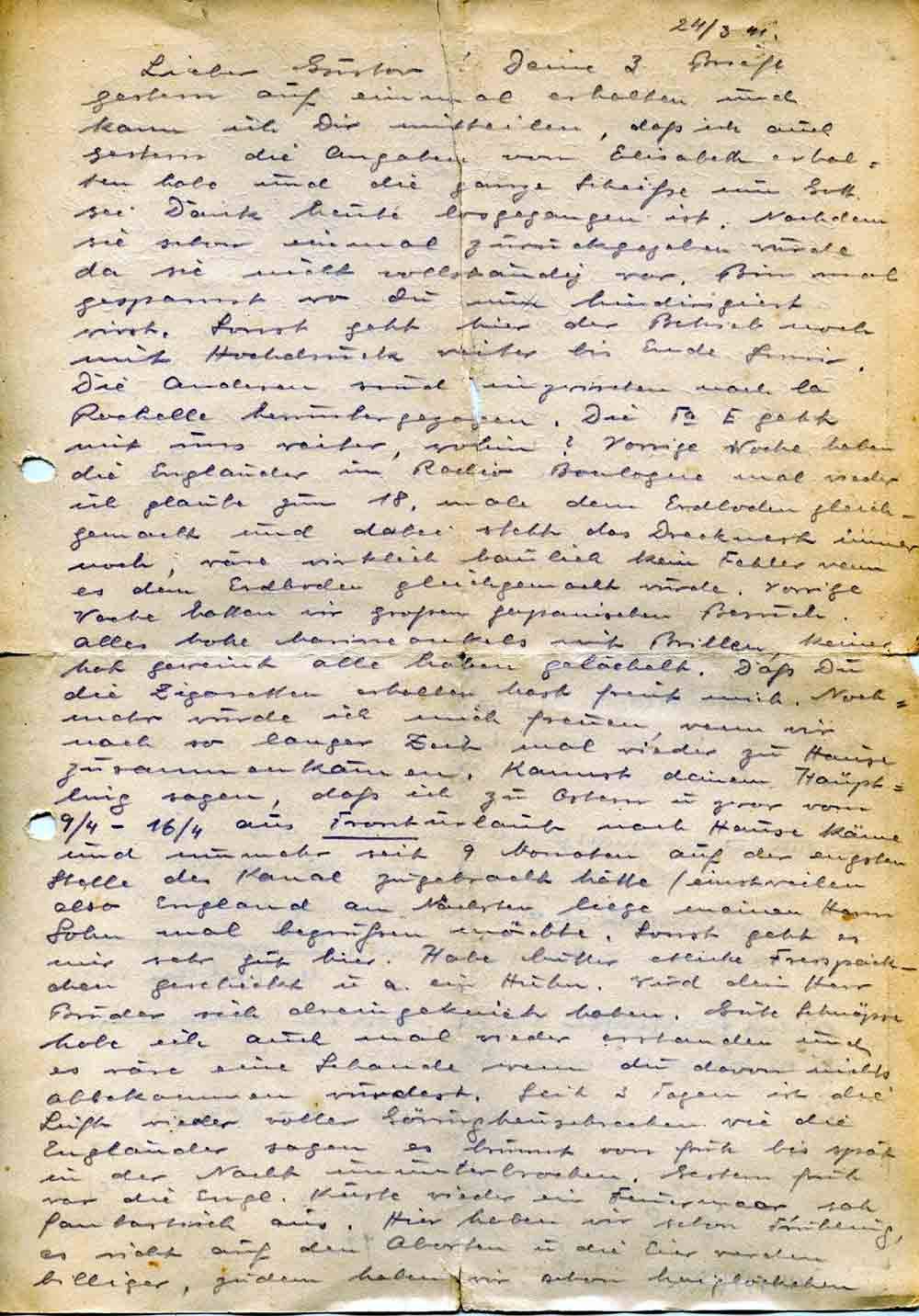 Lieber Gustav! Deine 3 Briefe gestern auf einmal erhalten und kann ich Dir mitteilen, daß ich auch gestern die Angaben von Elisabeth erhalten habe und die ganze Scheiße nun Gott sei Dank heute losgegangen ist. Nachdem sie schon einmal zurückgegeben wurde da sie nicht vollständig war. Bin mal gespannt wo Du nun hindirigiert wirst. Sonst geht hier der Betrieb noch mit Hochdruck weiter bis Ende Juni. Die Anderen sind inzwischen nach la Rochelle herübergegangen. Die Fa. E. geht mit uns weiter, wohin? Vorige Woche haben die Engländer im Radio Boulogne mal wieder ich glaube zum 18. male dem Erdboden gleichgemacht und dabei steht das Dreckwerk immer noch, wäre wirklich baulich kein Fehler wenn es dem Erdboden gleichgemacht würde. Vorige Woche hatten wir großen japanischen Besuch. Alles hohe Marineonkels mit Brillen, keiner hat geweint alle haben gelächelt. Daß Du die Zigaretten erhalten hast freut mich. Nochmehr würde ich mich freuen, wenn wir nach so langer Zeit mal wieder zu Hause zusammenkämen. Kannst deinem Häuptling sagen, daß ich zu Ostern u. zwar vom 9/4-16/4. aus Fronturlaub nach Hause käme und nunmehr seit 9 Monaten auf der engsten Stelle des Kanal zugebracht hätte (einstweilen also England am Nächsten liege meinen Herrn Sohn mal begrüßen möchte. Sonst geht es mir sehr gut hier. Habe Mutter etliche Fresspäckchen geschickt u. a. ein Huhn. Wird dein Herr Bruder sich dreingekniet haben. Gute Schnäpse habe ich auch mal wieder erstanden und es wäre eine Schande wenn du davon nichts abbekommen würdest. Seit 3 Tagen isst die Luft wieder voller Göring[?] wie die Engländer sagen es brummt von früh bis spät in der Nacht ununterbrochen. Gestern früh war die Engl. Küste wieder ein Feuermeer, sah fantastisch aus. Hier haben wir schon Frühling, es riecht auf den Aborten u. die Eier werden billiger, zudem haben wir schon Maiglöckchen