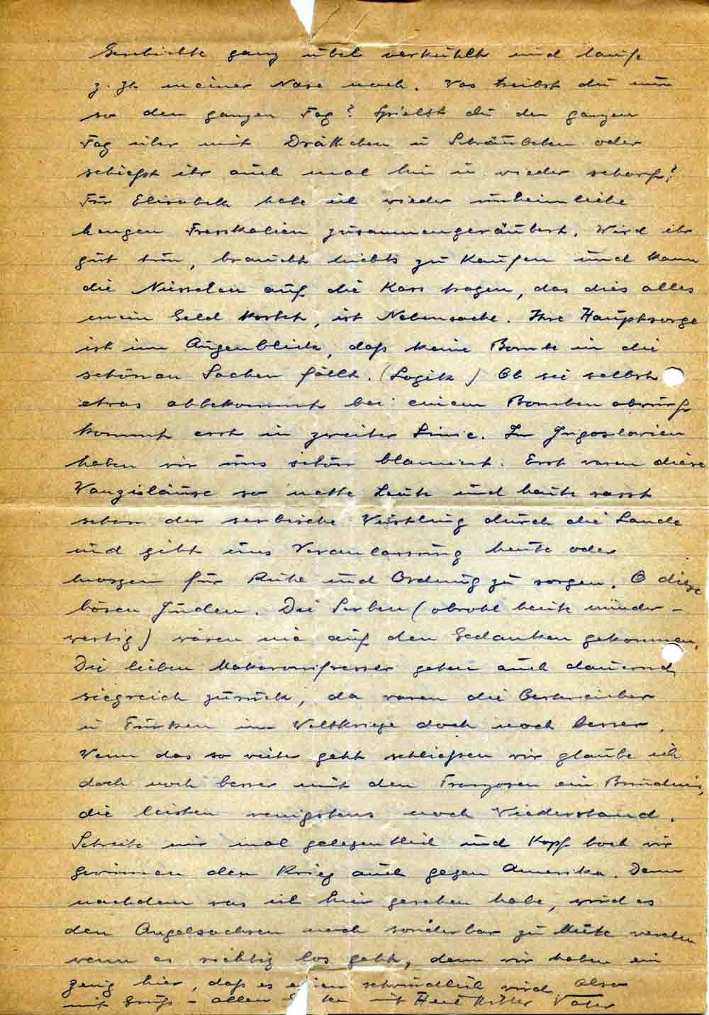 Geschichte ganz übel verkühlt und laufe z. Zt. meiner Nase nach. Was treibst Du nun so den ganzen Tag? Spielst du den ganzen Tag über mit Drähtchen u. Schräubchen oder schießt ihr auch mal hin u. wieder scharf? Für Elisabeth habe ich wieder unheimliche Mengen Fresskalien zusammengeräubert. Wird ihr gut tun, braucht nichts zu kaufen und kann die Nüsselen auf die Kass tragen, das dies alles mein Geld kostet, ist Nebensache. Ihre Hauptsorge ist im Augenblick, daß keine Bombe in die schönen Sachen fällt. (Logik) Ob sie selbst etwas abbekommt bei einem Bombenabwurf kommt erst in zweiter Linie. In Jugoslawien haben wir uns schön blamiert. Erst waren diese Wanzisläuse so nette Leute und heute rast schon der serbische Wüstling durch die Lande und gibt uns Veranlassung heute oder morgen für Ruhe und Ordnung zu sorgen. O diese bösen Juden. Die Serben (obwohl heute minderwertig) wären nie auf den Gedanken gekommen. Die lieben Makaronifresser gehen auch dauernd siegreich zurück, da waren die Oesterreicher u. Türken im Weltkriege doch noch besser. Wenn das so weiter geht schließen wir glaube ich doch noch besser mit den Franzosen ein Bündnis, die leisten wenigstens noch Wiederstand. Schreibe mir mal gelegentlich und Kopf hoch wir gewinnen den Krieg auch gegen Amerika. Denn nachdem was ich hier gesehen habe, wird es den Angelsachsen noch sonderbar zu Mute werden wenn es richtig los geht, denn wir haben ein Zeug hier, daß es einem schwindlich wird. Also mit Gruß – allem Guten mit Heil Hitler Vater.